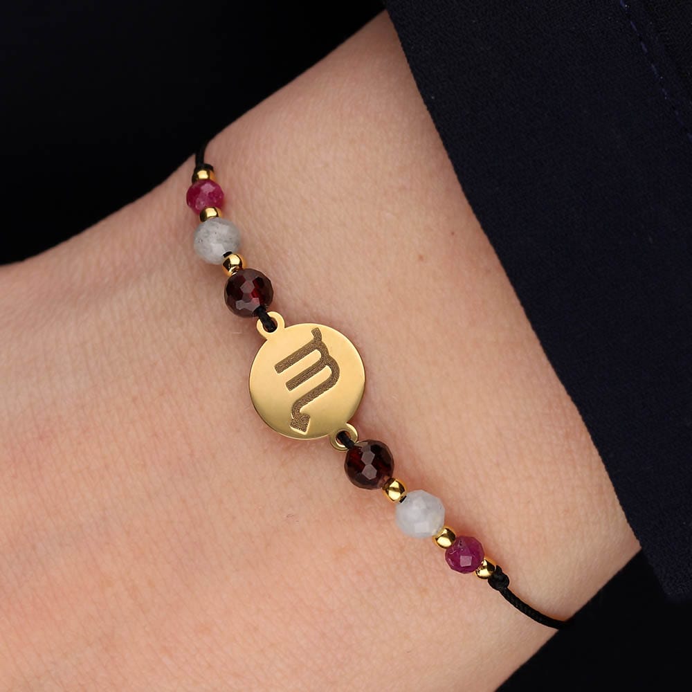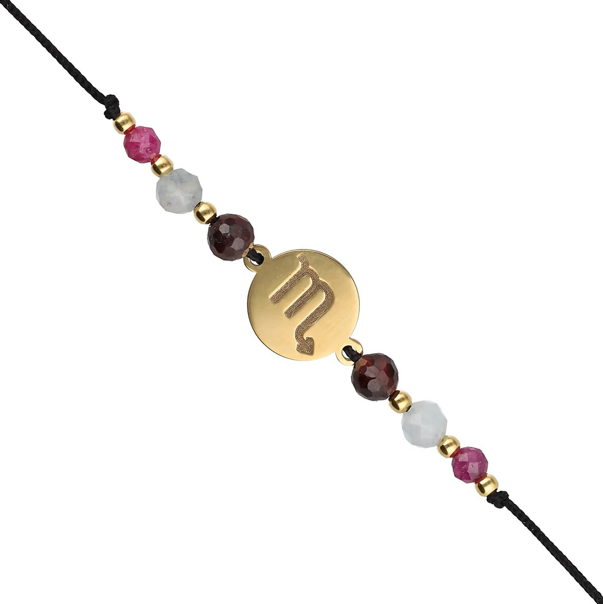 Bransoletka dla Skorpiona na sznurku z celebrytką, granatem, akwamarynem i rubinem