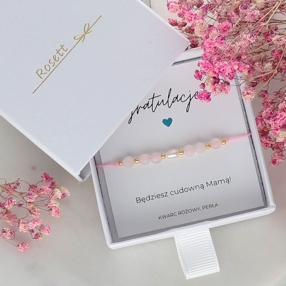 Ta delikatna bransoletka została wykonana z najwyższej jakości materiałów. Ozdobiona została różowym kwarcem – kamieniem miłości i delikatności. Na środku znajduje się perła, będąca wyrazem czystości, niewinności i mądrości. Perła jest również symbolem matki oraz nowego życia, co czyni ten prezent jeszcze bardziej znaczącym.
