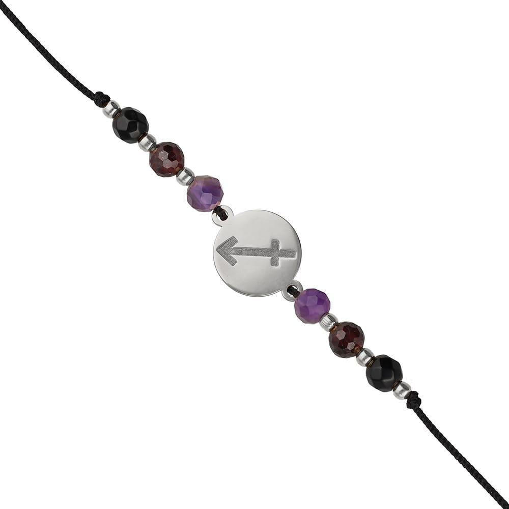 Na sznurku bransoletki są również kamienie naturalne charakterystyczne dla znaku zodiaku Strzelec: ametyst, granat, spinel. Każdy kamień w formie kulki fasetowanej wielkości 4mm, która dodatkowo nadaje blasku kompozycji.