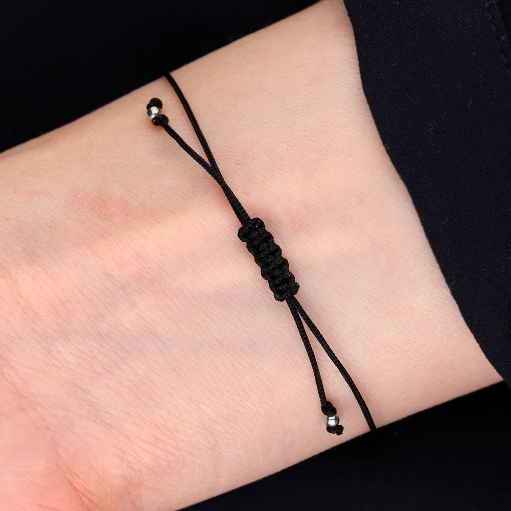 Damska bransoletka dla Strzelca srebrna z kamieniami. Bransoletka na czarnym sznurku z celebrytką z grawerem znaku zodiaku.