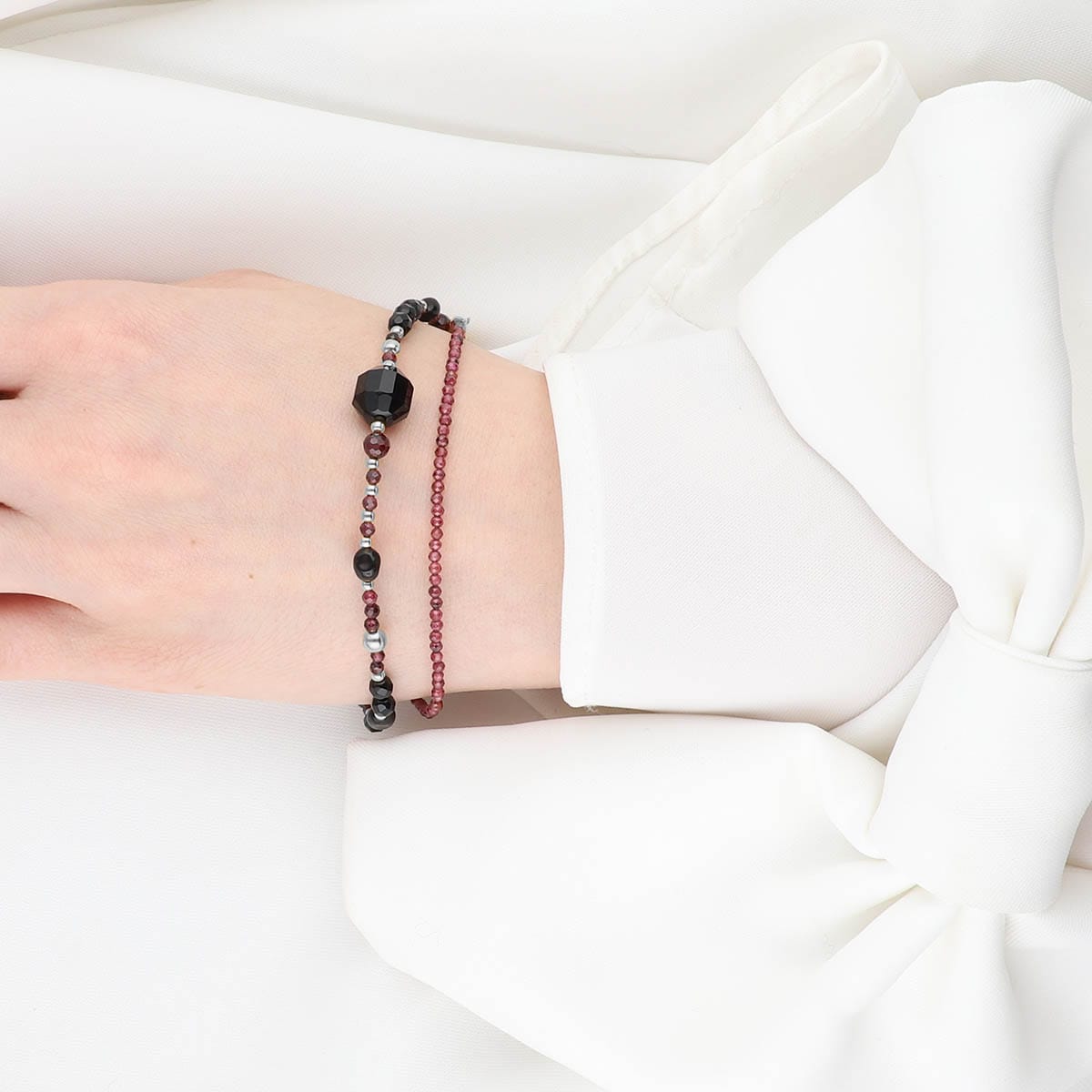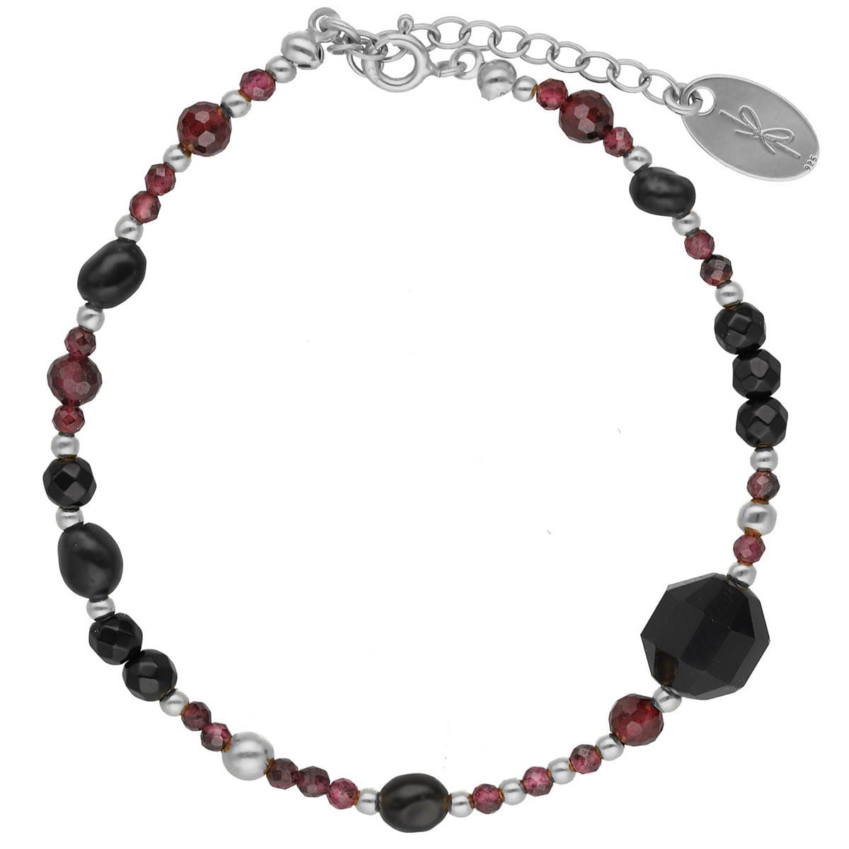 Odkryj hipnotyzujące połączenie eleganckiej czerni z żywym bordo, tworzące niepowtarzalny efekt wizualny. Ta srebrna bransoletka składa się z precyzyjnie oszlifowanych kamieni granatu i onyksu, które pięknie odbijają światło z każdym ruchem ręki oraz gładkich bryłek czarnego obsydianu, które razem tworzą bogactwo faktur i głębi. Całość jest zaakcentowana srebrnymi kuleczkami, które nadają całości eleganckiego blasku.