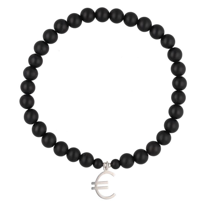 Męska elastyczna bransoletka wykonana z czarnych matowych kulek agatu wielkości 6 mm i srebrnym elementem z motywem Euro. Wszystkie srebrne elementy wykonane zostały ze srebra próby 925 i zabezpieczone warstwą rodu.