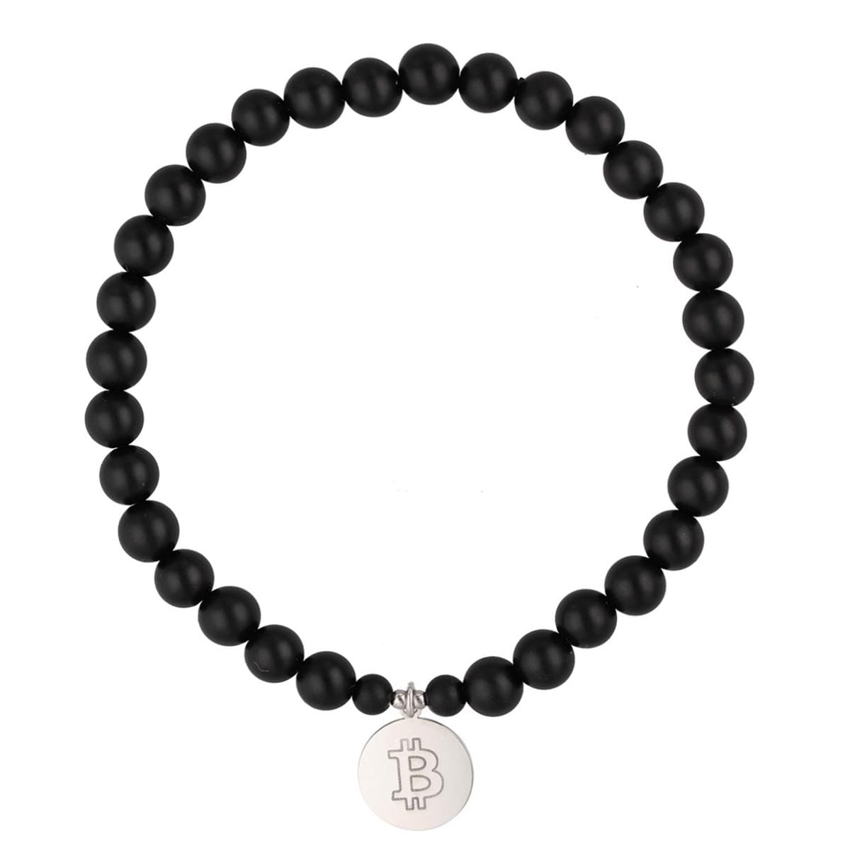 Męska elastyczna bransoletka wykonana z czarnych matowych kulek agatu wielkości 6 mm i blaszką ze srebra z logo kryptowaluty Bitcoin. Wszystkie srebrne elementy wykonane zostały ze srebra próby 925 i zabezpieczone warstwą rodu.