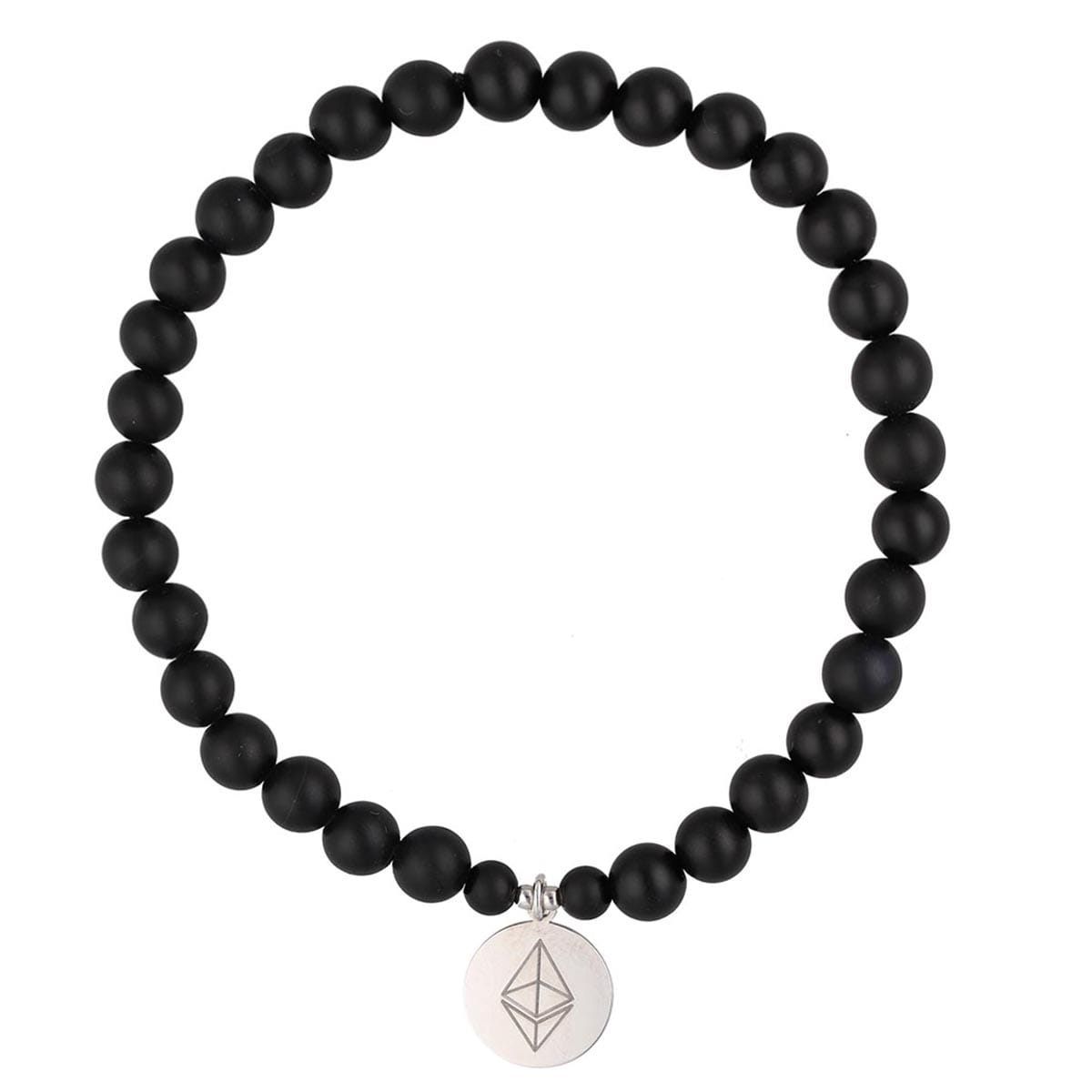 Męska elastyczna bransoletka wykonana z czarnych matowych kulek agatu wielkości 6 mm i blaszką ze srebra z logo kryptowaluty Ethereum. Wszystkie srebrne elementy wykonane zostały ze srebra próby 925 i zabezpieczone warstwą rodu.