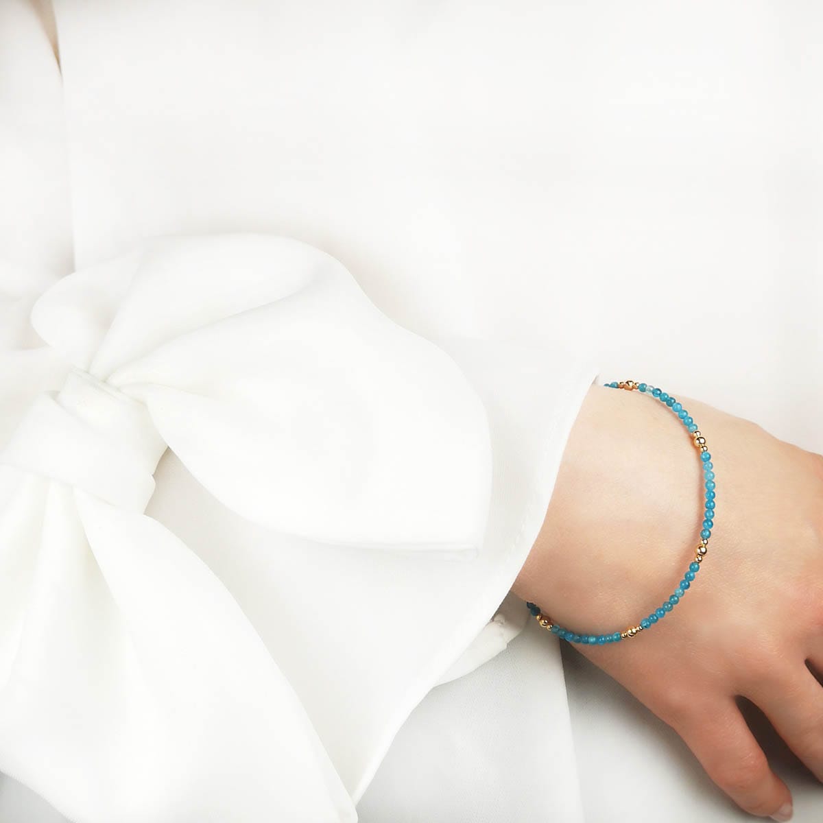 Damska bransoletka z naturalnego niebieskiego apatytu oraz kuleczek gold filled w rozmiarze 2mm.