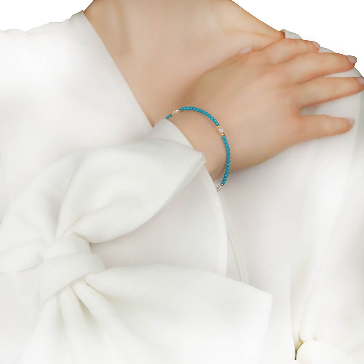 Damska bransoletka wykonana z kuleczek naturalnego turkusu w rozmiarze 2mm, srebra próby 925 powleczonego 24-karatowym złotem, o grubości powłoki ok. 1µm. oraz pereł hodowlanych.