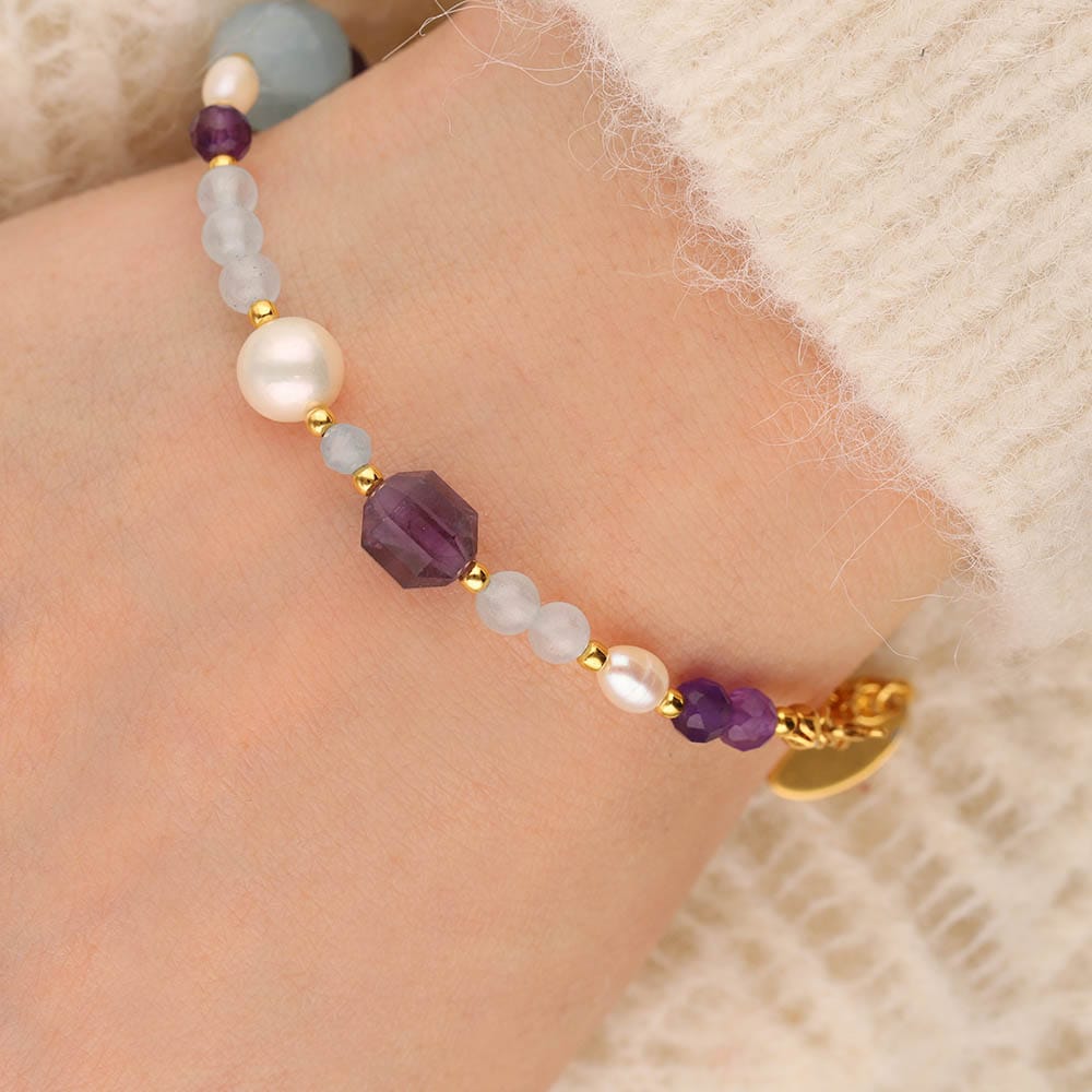 Elegancka bransoletka z akwamarynem, ametystem i perłami