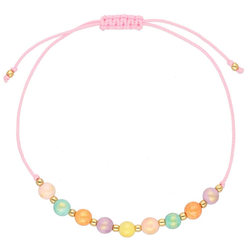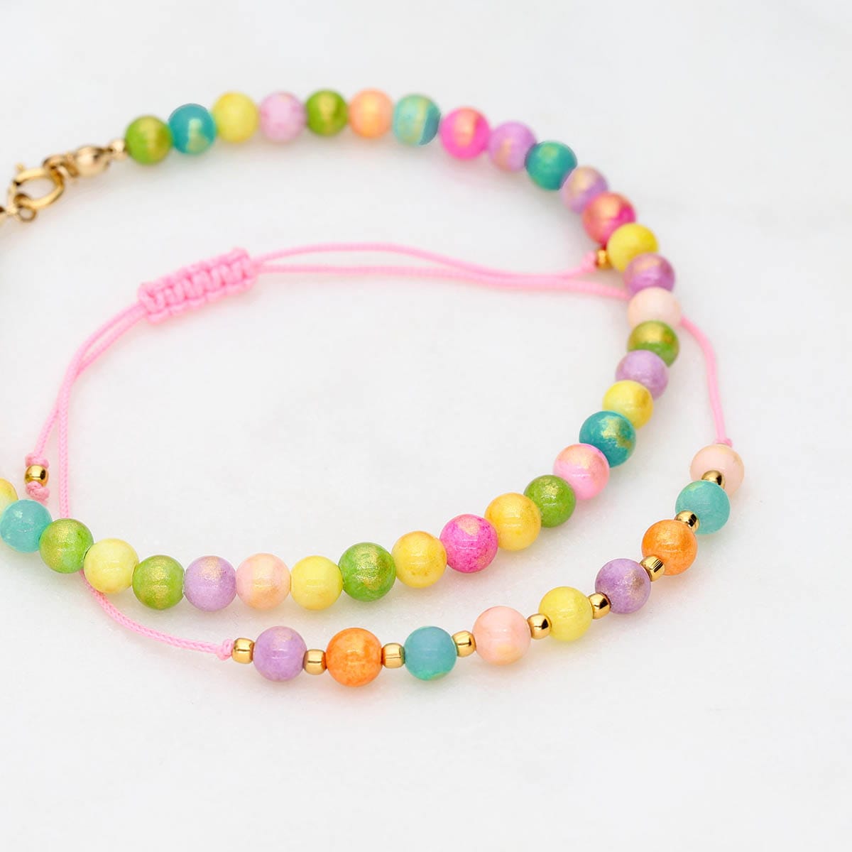 Bransoletka damska na różowym sznurku przywodząca na myśl kolorową tęczę skąpaną w promieniach słońca. Wykonana została z barwionego jadeitu, muśniętego złotym kolorem i kuleczek srebra pozłacanego.