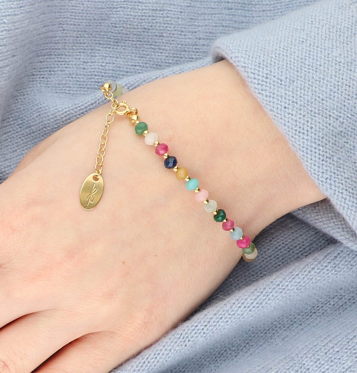 Bransoletka damska z kolorowego jadeitu fasetowanego oraz srebra próby 925 powleczonego 24-karatowym złotem, o grubości powłoki ok. 1µm.