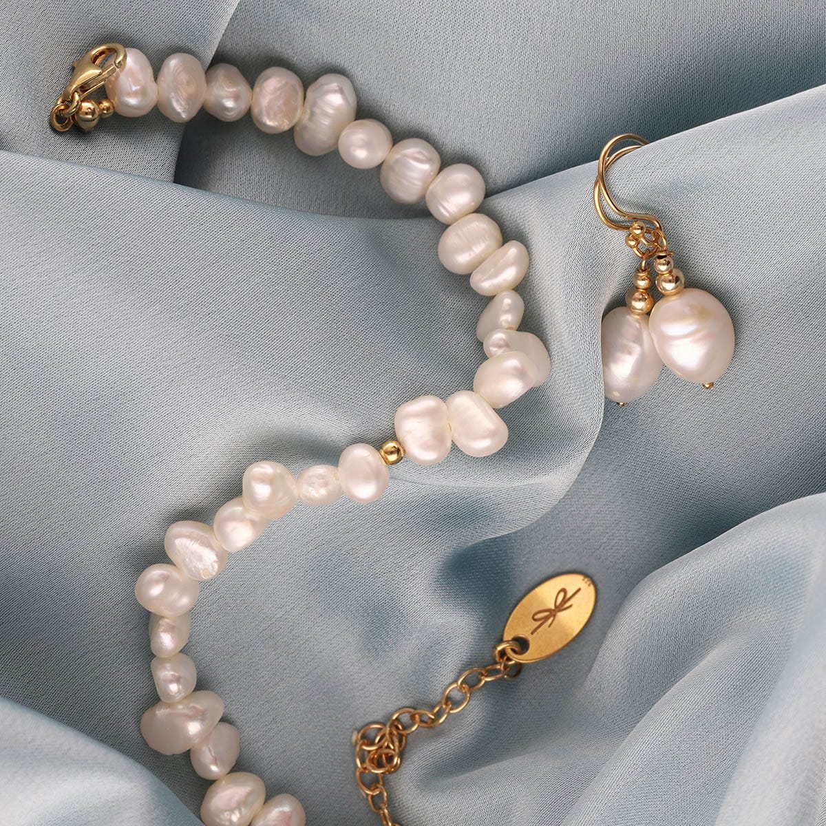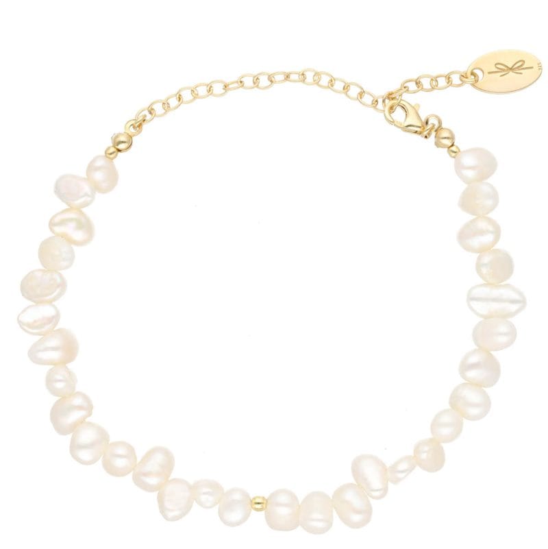Bransoletka z perłami o ponadczasowym kobiecym wzornictwie wykonana z nieregularnych pereł hodowlanych, wykończona kuleczką oraz łańcuszkiem ze srebra próby 925 powleczonego 24-karatowym złotem, o grubości powłoki ok. 1µm.