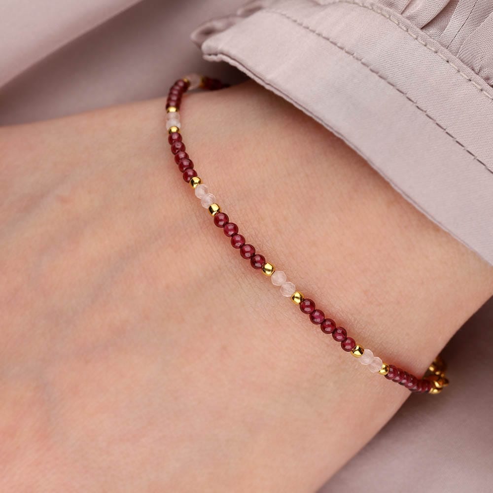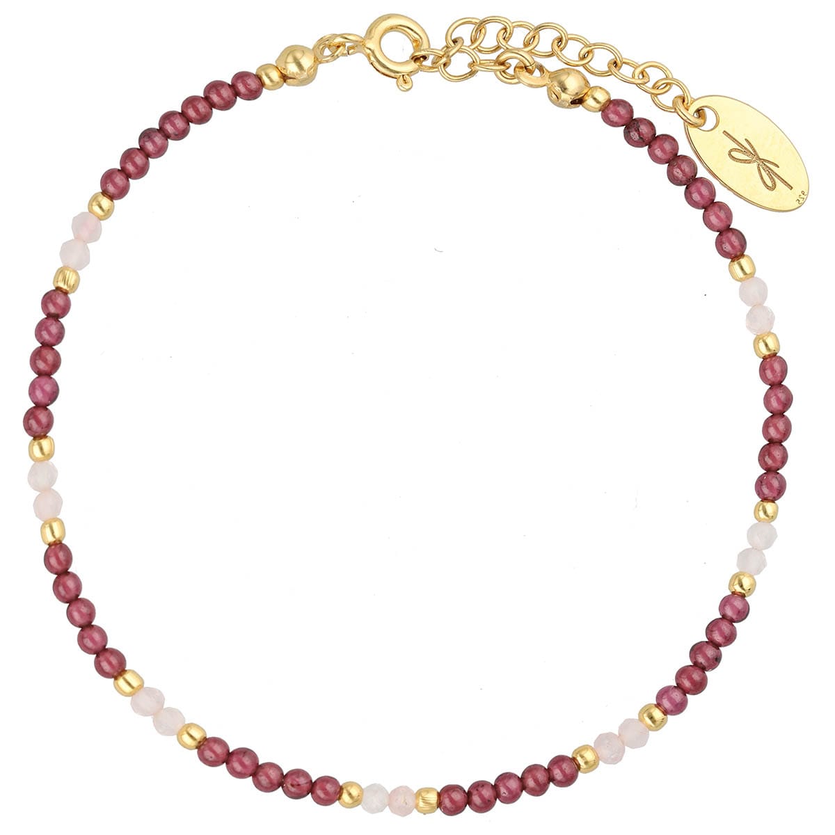 Damska bransoletka z kamieniami naturalnymi – kwarcem różowym i granatem w rozmiarze 2mm. Bransoletka z elementami ze srebra próby 925 pokrytego żółtym złotem, o grubości powłoki ok. 1µm.