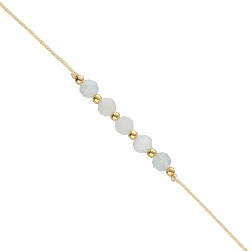 Damska bransoletka z akwamarynem na beżowym sznurku.