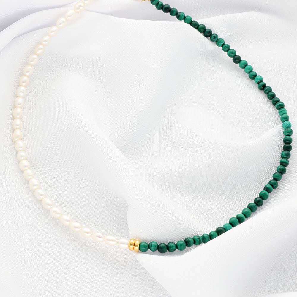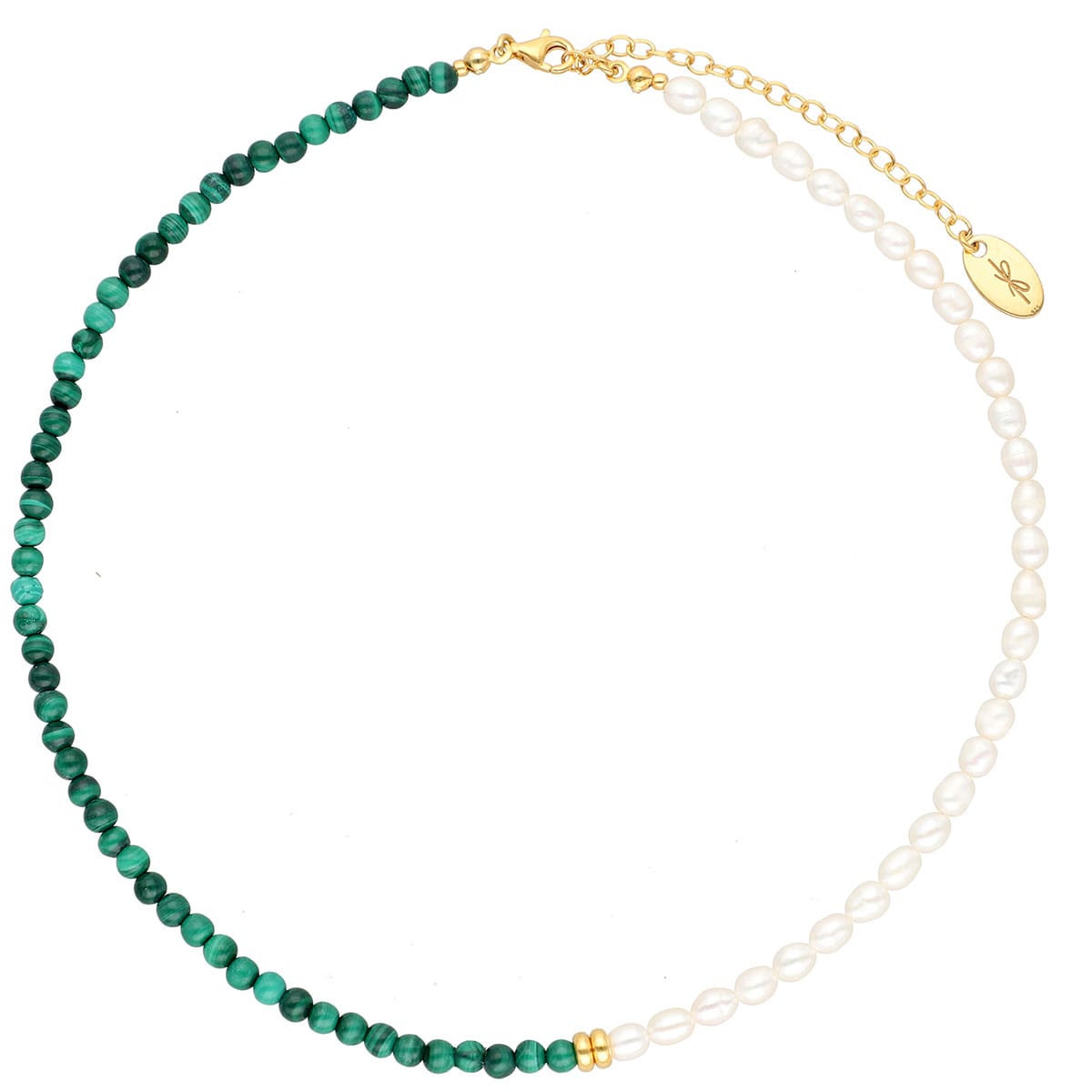 Naszyjnik damski srebrny pozłacany – choker na szyję z pereł hodowlanych i zielonego malachitu, uzupełniony elementami ze srebra próby 925 powleczonego 24-karatowym złotem, o grubości powłoki ok. 1µm.