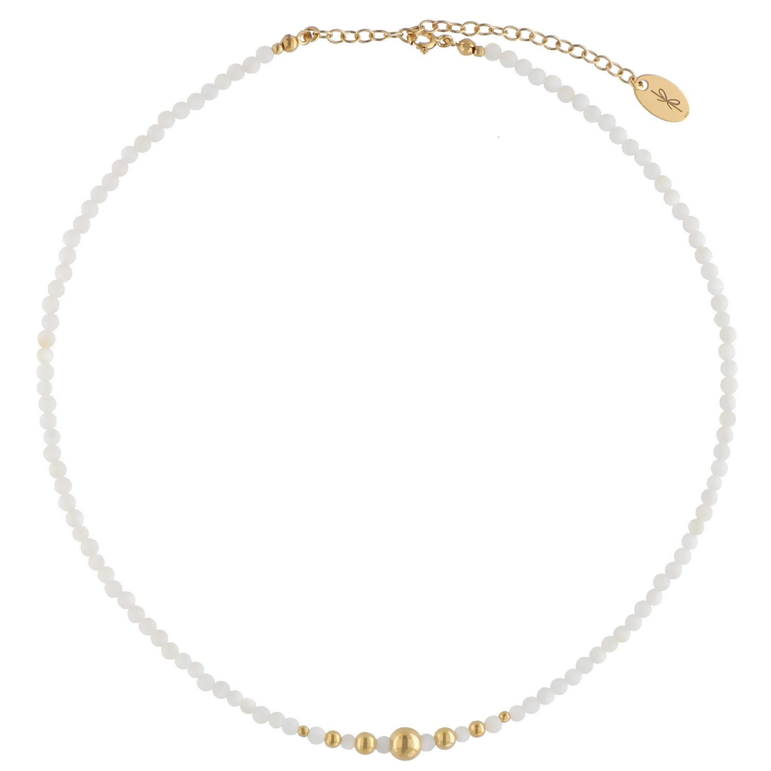 Naszyjnik ten charakteryzuje się unikalnym designem, który łączy w sobie klasykę i nowoczesność. Masa perłowa dodaje mu niepowtarzalnego uroku, a jej delikatny połysk pięknie komponuje się z pozłacanym wykończeniem naszyjnika i  dodaje mu luksusowego charakteru.