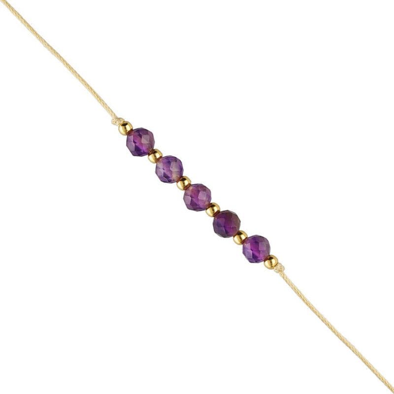 Bransoletka została wykonana z beżowego sznureczka, na którym umieszczono ametyst – kamień szczęścia dla Strzelca, Koziorożca, Ryb i Wodnika. Efektownie oszlifowane kamienie mają kształt kulki o średnicy 4mm. Ich głęboka barwa doskonale kontrastuje z beżem, co dodaje bransoletce elegancji.