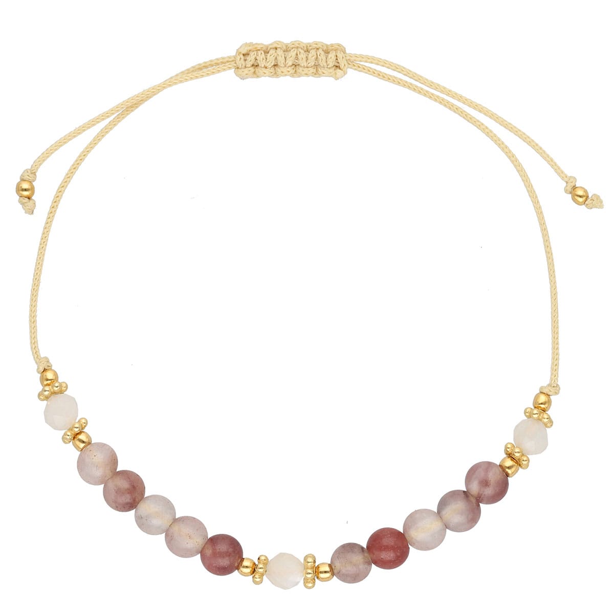 Bransoletka damska na beżowym sznurku z kwarcem i przekładkami ze srebra próby 925. Srebrne elementy zostały pozłocone grubą warstwą złota.