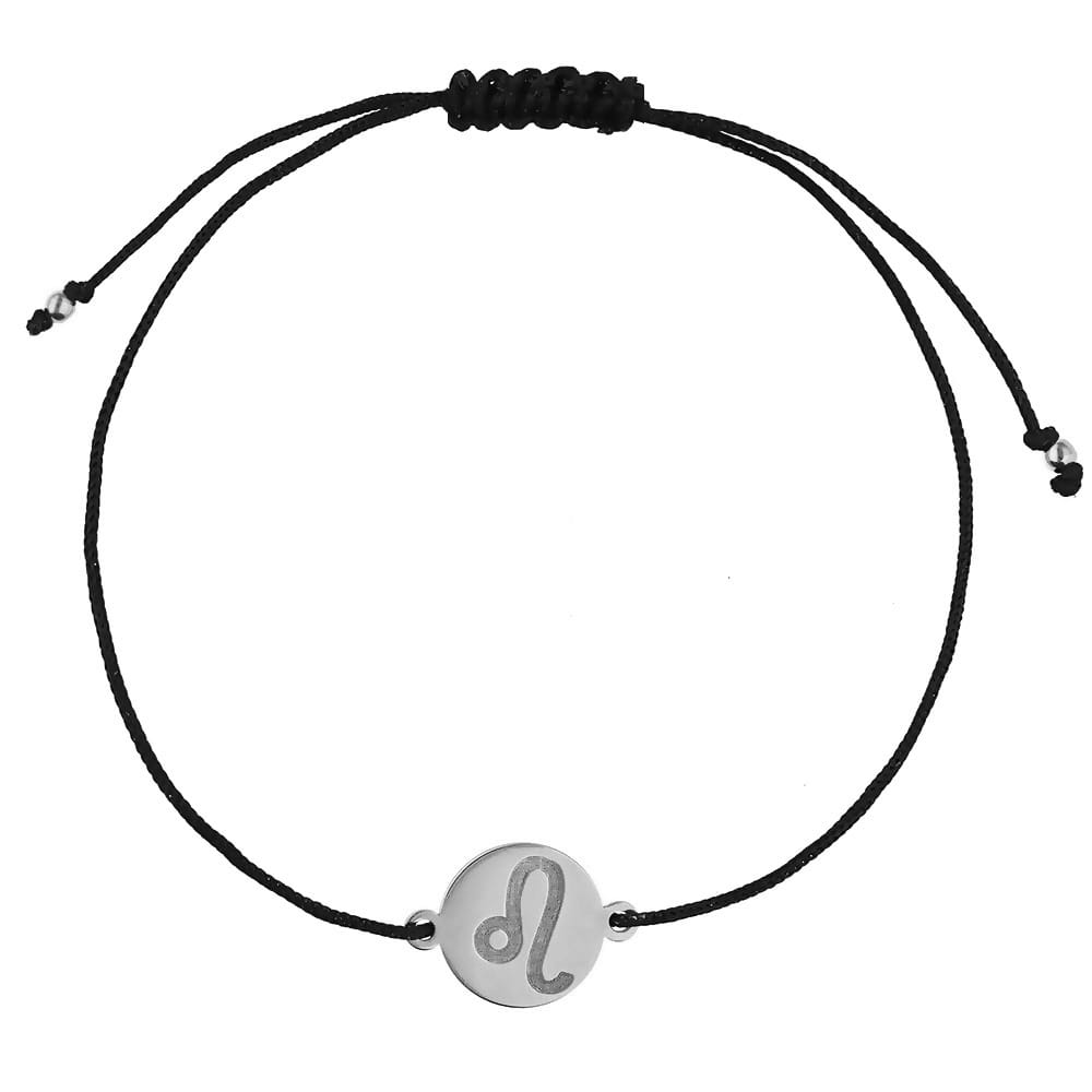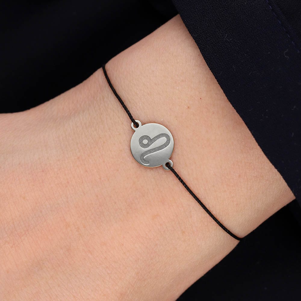 Srebrna damska bransoletka na sznurku Zodiak Lew. Bransoletka na czarnym sznurku z celebrytką z grawerem znaku zodiaku Lew.