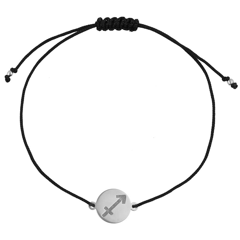 Srebrna damska bransoletka na sznurku Zodiak Strzelec. Bransoletka na czarnym sznurku z celebrytką z grawerem znaku zodiaku Strzelec.