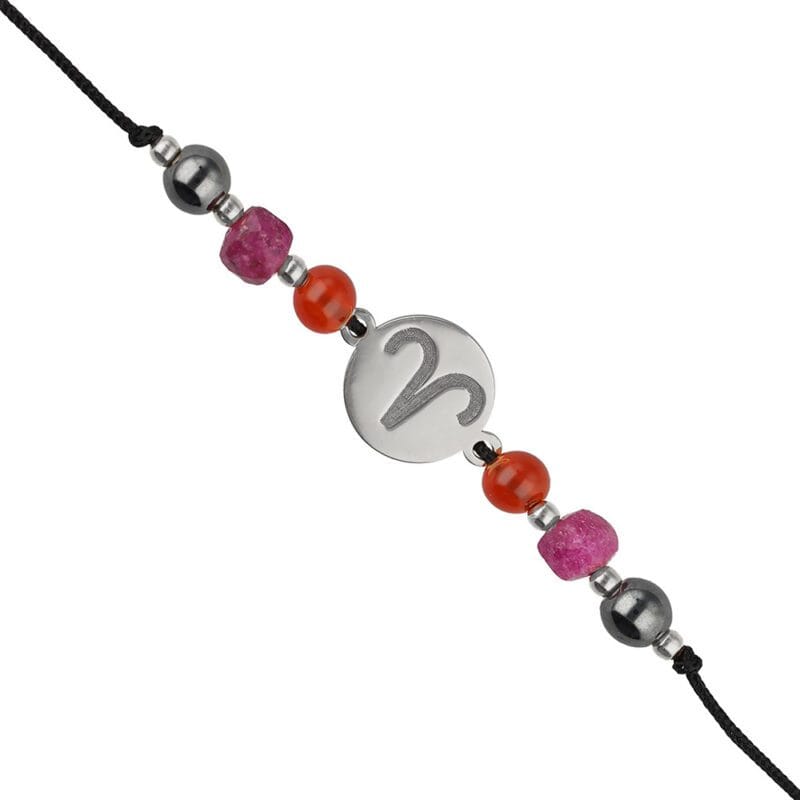 Na sznurku bransoletki są również kamienie naturalne charakterystyczne dla znaku zodiaku Barana: karneol, hematyt i rubin. Każdy kamień w formie kulki gładkiej wielkości 4mm.