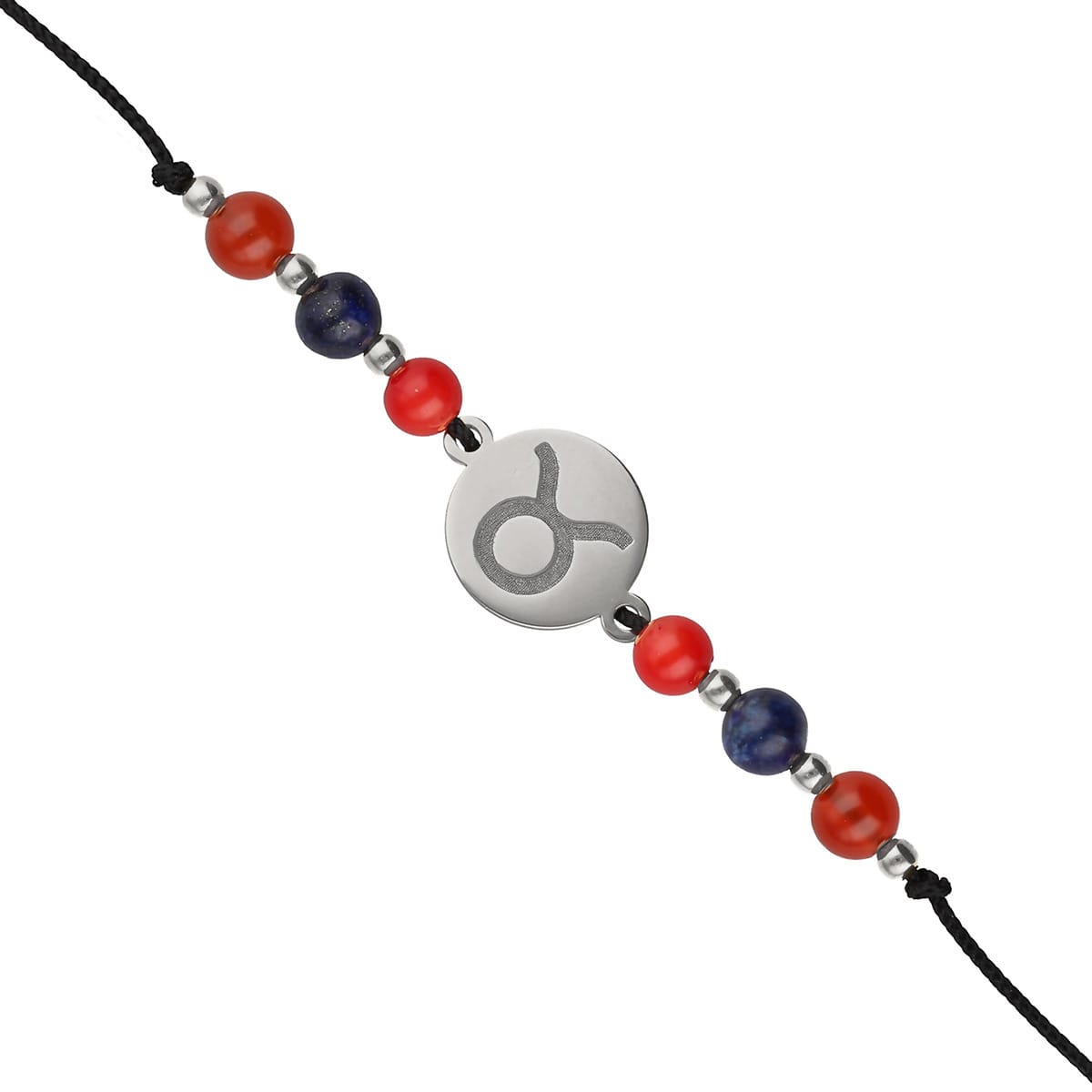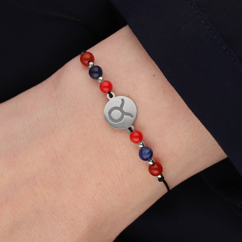 Na sznurku bransoletki są również kamienie naturalne charakterystyczne dla znaku zodiaku Byk: karneol, lapis lazuli, koral. Każdy kamień w formie kulki gładkiej wielkości 4mm.