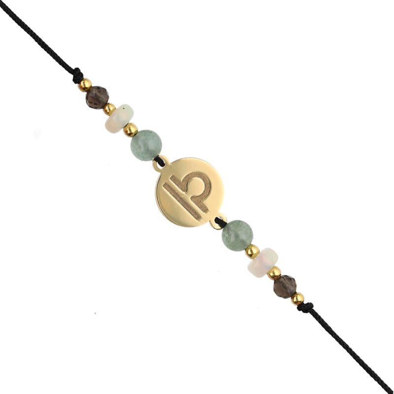Na sznurku bransoletki są również kamienie naturalne charakterystyczne dla znaku zodiaku Wagi: awenturyn, kwarc dymny i opal.