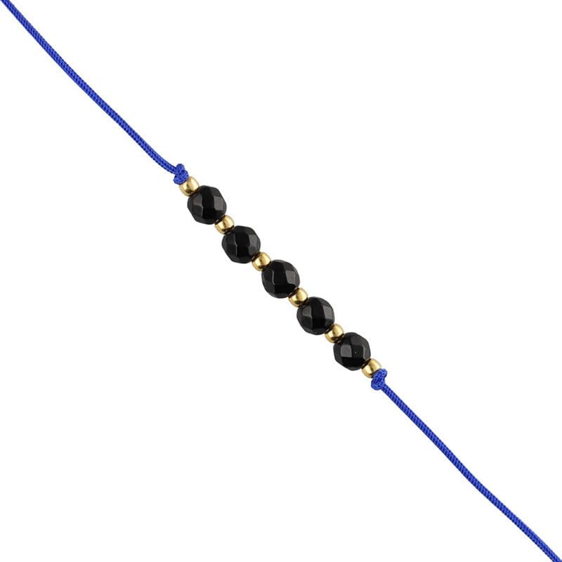 Bransoletka została wykonana z niebieskiego sznureczka, na którym umieszczono onyks – kamień szczęścia dla Bliźniąt, Lwa i Koziorożca. Efektownie oszlifowane kamienie mają kształt kulki o średnicy 4mm. Jego głęboka czerń doskonale komponuje się z żywym odcieniem sznurka, co nadaje bransoletce charakteru.