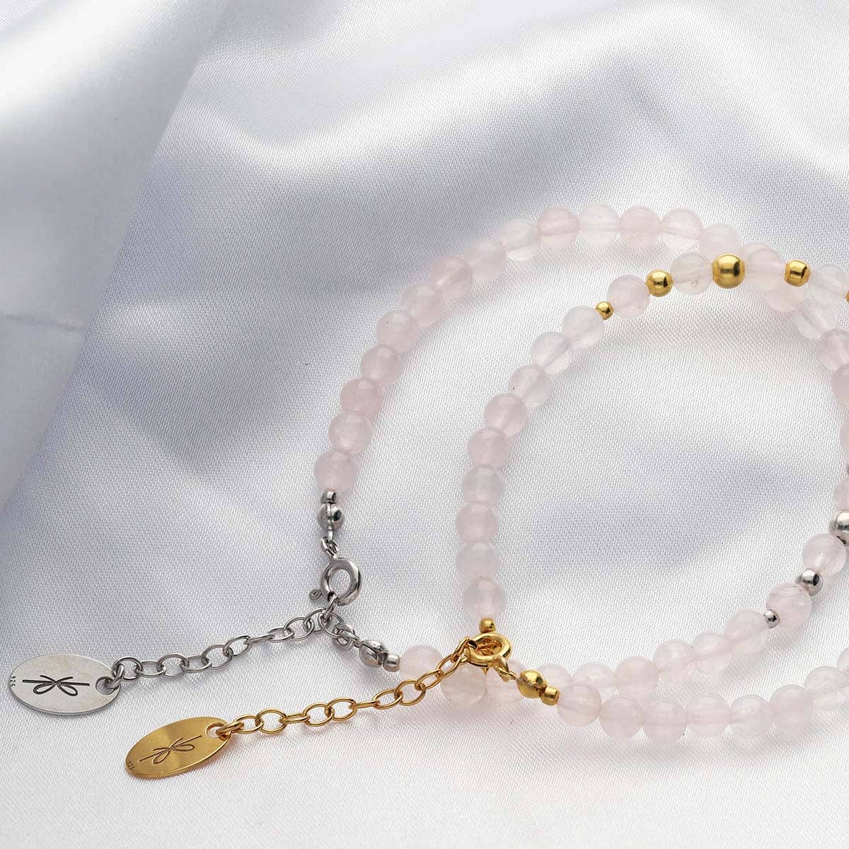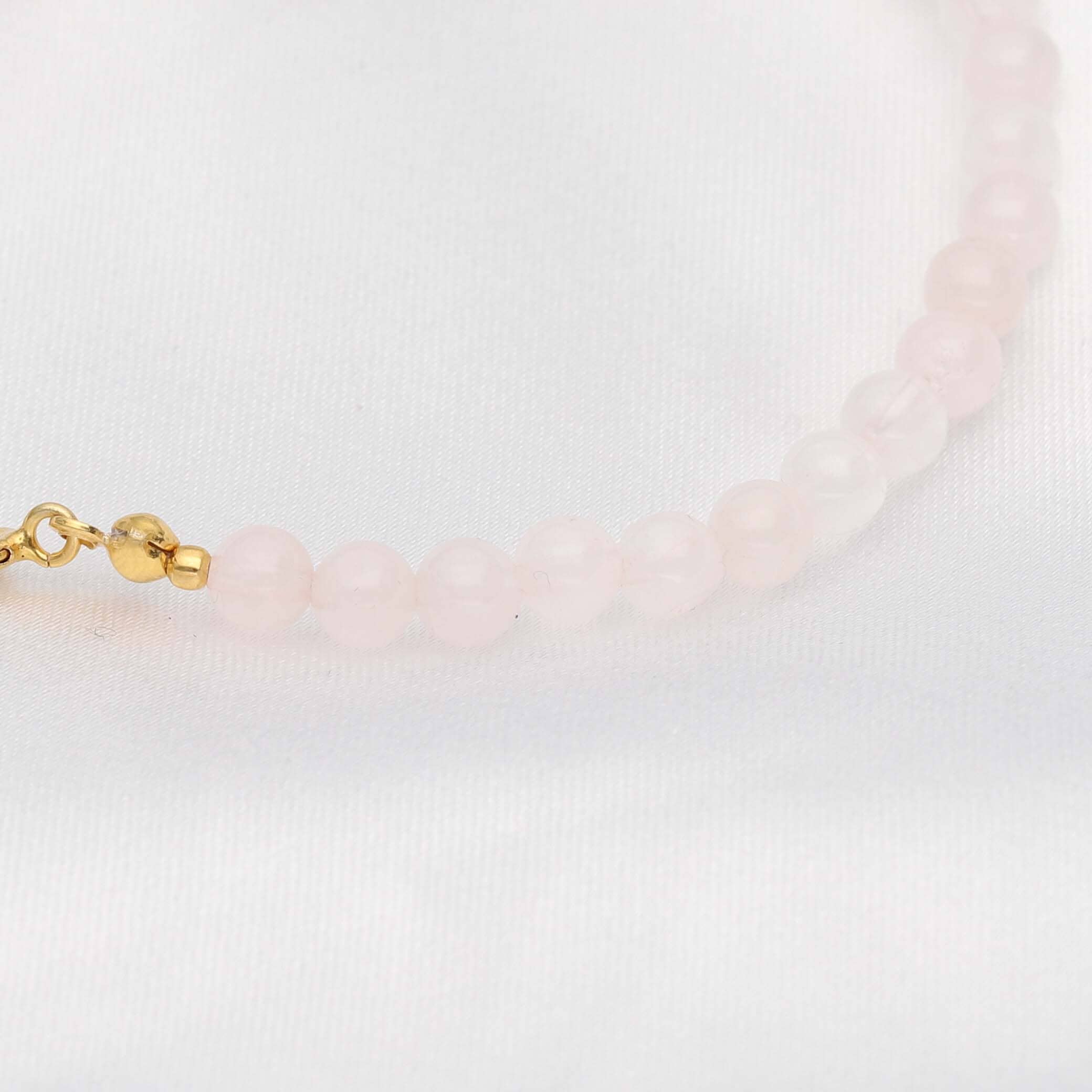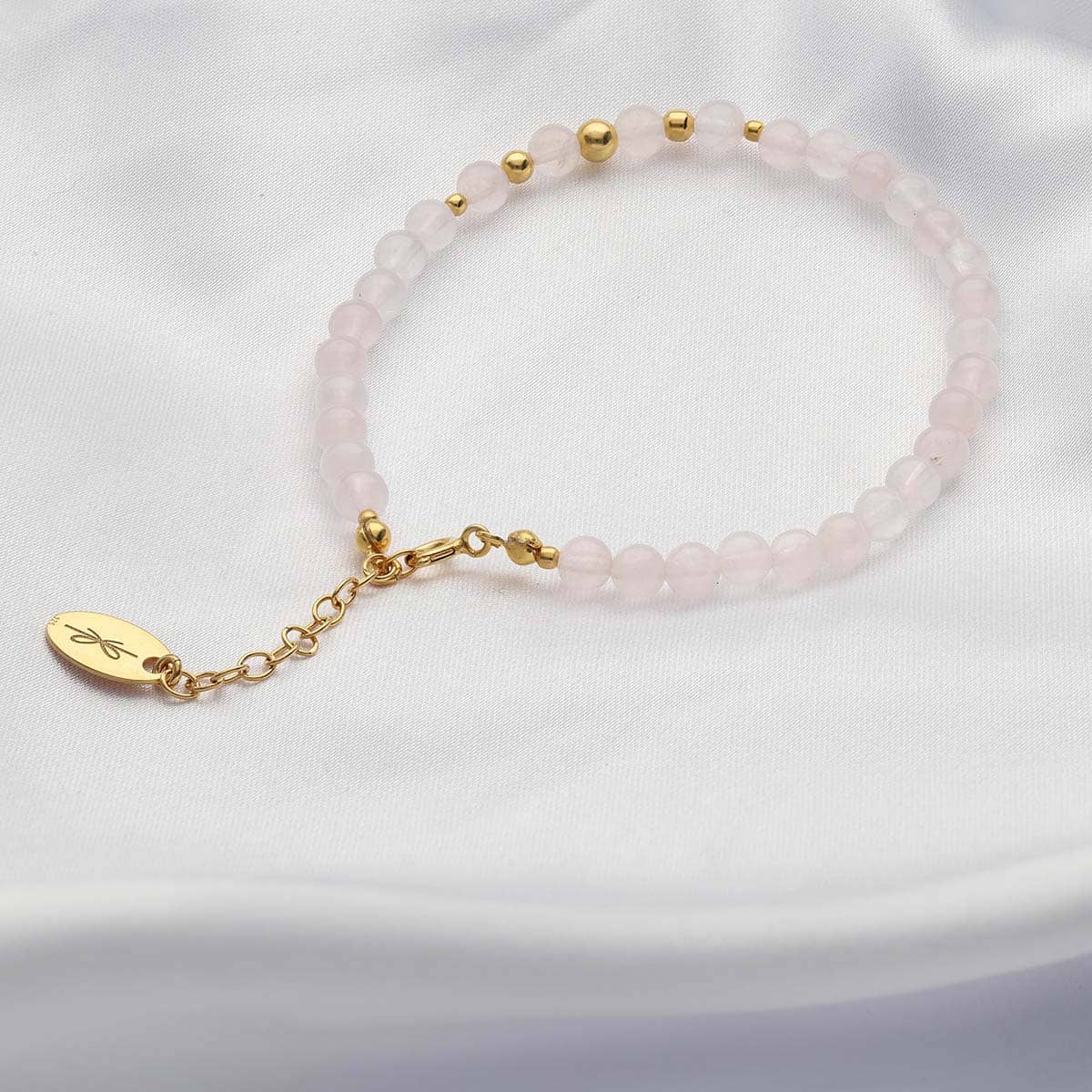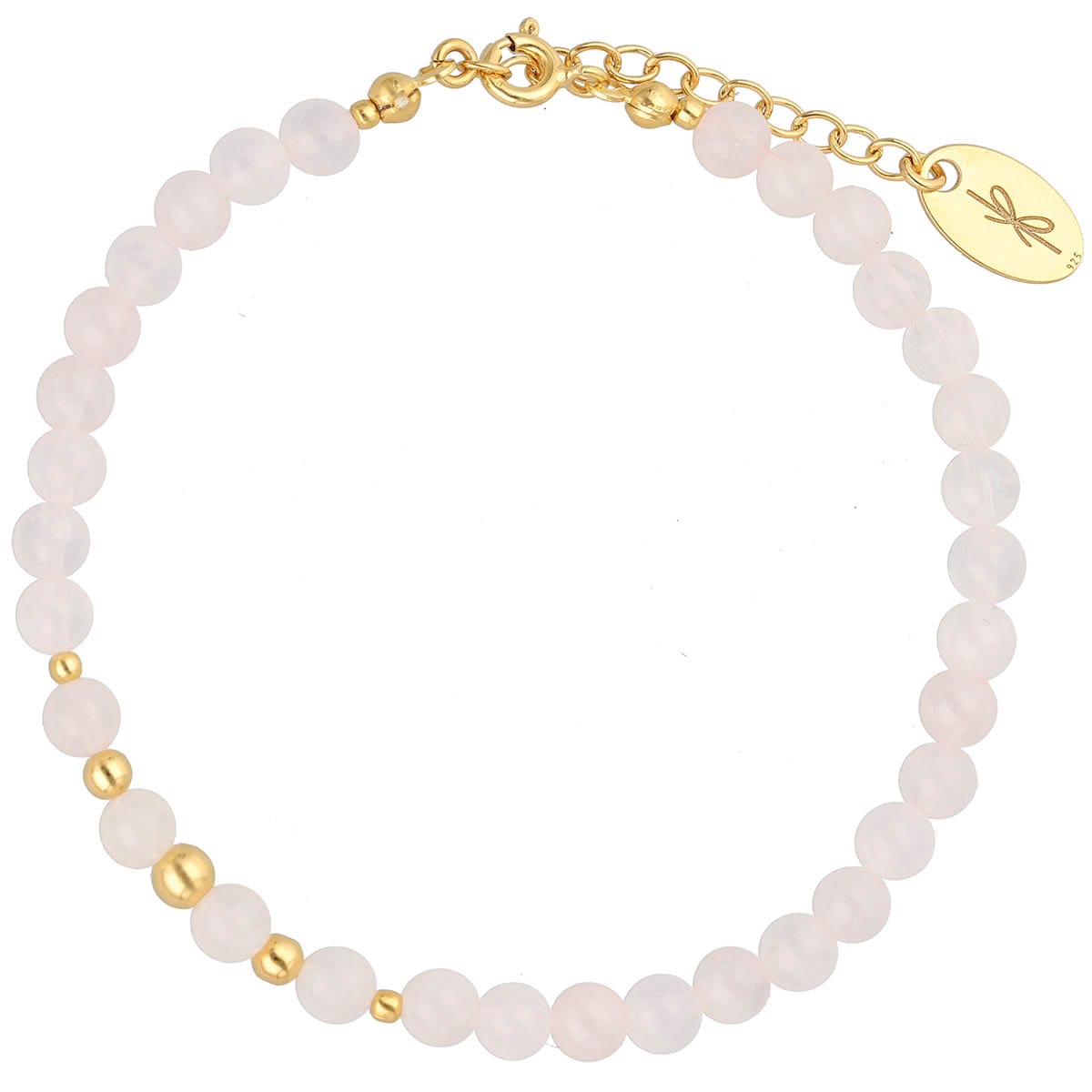 Damska bransoletka z różowym kwarcem. Kulki kwarcu naturalnego gładkie wielkości 4mm, natomiast pozostałe elementy wykonane ze srebra próby 925 pokrytego żółtym złotem, o grubości powłoki ok. 1µm.