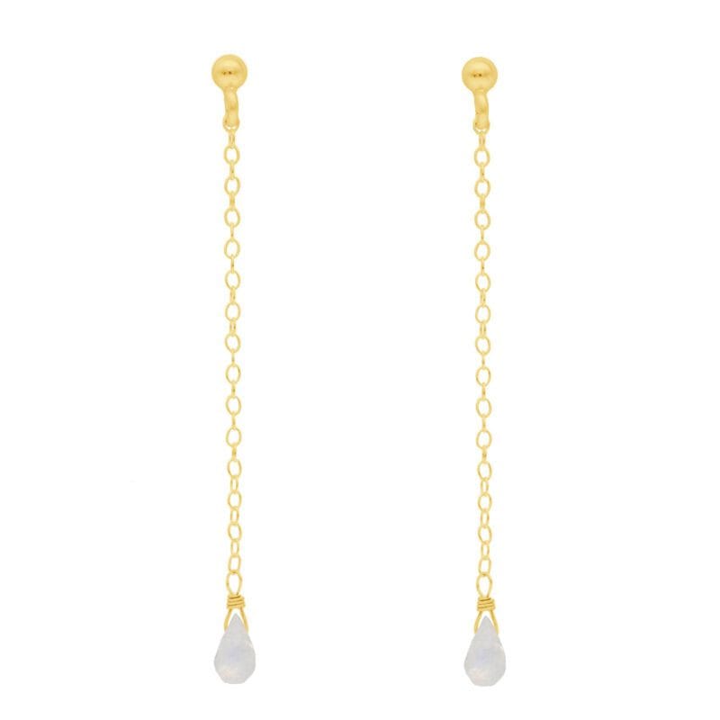 Damskie kolczyki srebrne pozłacane długie wiszące na sztyfcie z kamieniem księżycowym. Kolczyk sztyft z kulką 3mm i podwieszoną pojedynczą brioletą kamienia księżycowego na łańcuszku ankier. Srebrne elementy zostały pokryte żółtym złotem, o grubości powłoki ok. 1µm, dzięki czemu warstwa o wiele dłużej pozostanie złota.
