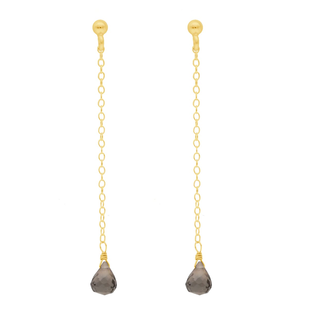 Damskie kolczyki srebrne pozłacane długie wiszące na sztyfcie z kwarcem dymnym. Kolczyk sztyft z kulką 3mm i podwieszoną pojedynczą brioletą brązowego kwarcu dymnego na łańcuszku ankier. Srebrne elementy zostały pokryte żółtym złotem, o grubości powłoki ok. 1µm, dzięki czemu warstwa o wiele dłużej pozostanie złota.