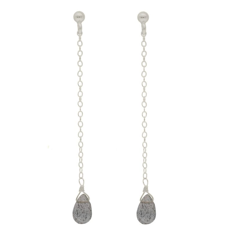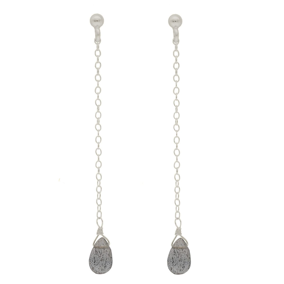 Damskie kolczyki srebrne rodowane długie wiszące na sztyfcie z labradorytem. Kolczyk sztyft z kulką 3mm i podwieszoną pojedynczą brioletą labradorytu na łańcuszku ankier. Srebrne elementy zostały zabezpieczone warstwą rodu, która chroni przed ścieraniem i ciemnieniem srebra.