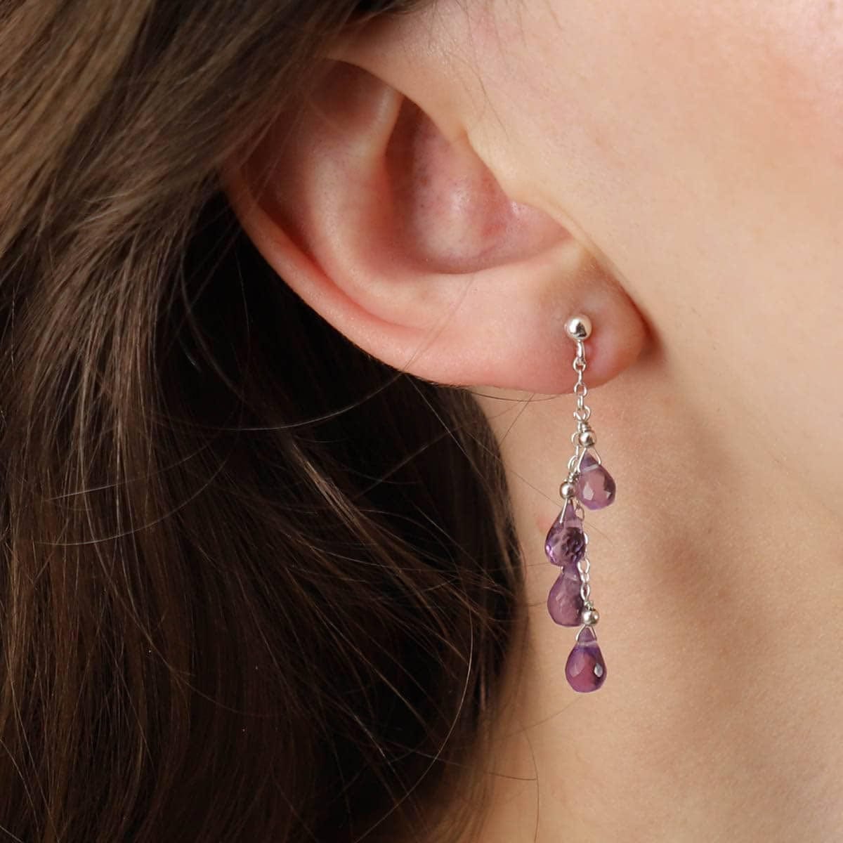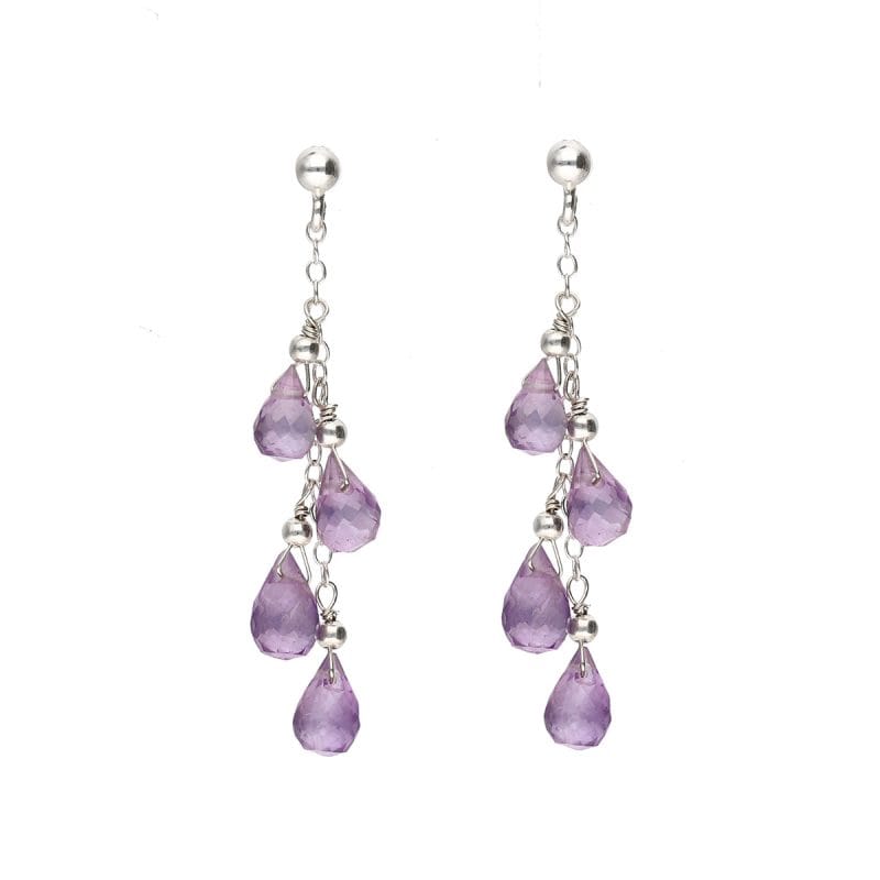 Kolczyki srebrne wiszące na sztyfcie z ametystem. Ametyst w formie fasetowanych briolet, srebro pokryte warstwą rodu, w celu zabezpieczenia produktu przed czernieniem i mechanicznymi uszkodzeniami.