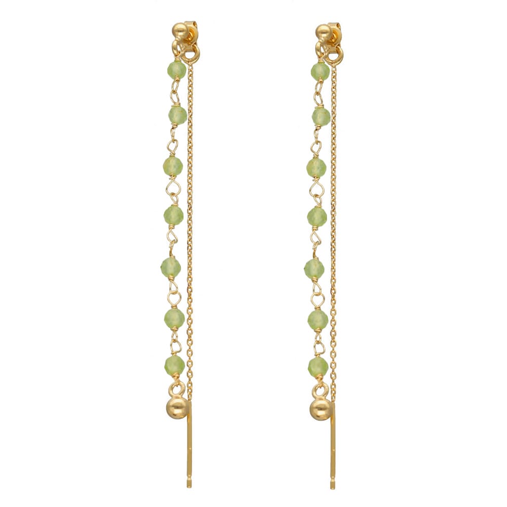 Głównym elementem kolczyków są fasetowane kuleczki perydotu, które efektownie odbijają światło, tworząc niezwykły efekt błysku. Kamienie są umieszczone na delikatnym łańcuszku, który dodaje biżuterii lekkości i elegancji. Łańcuszek jest zakończony ozdobną kuleczką.