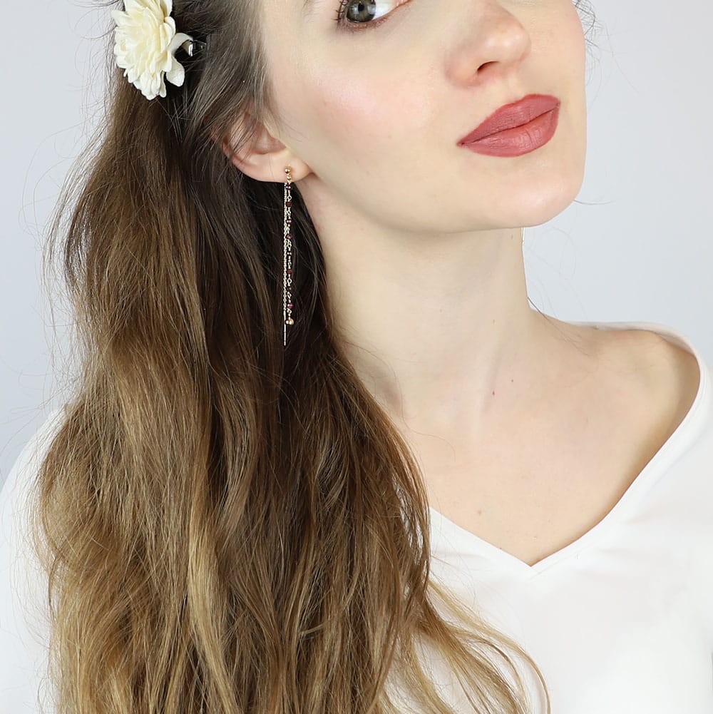 Kolczyki wiszące długie z granatem CHAIN to wyjątkowy dodatek, który przyciąga uwagę swoim niepowtarzalnym designem i elegancją. Dzięki swojej długości pięknie eksponują szyję i podkreślają rysy twarzy.