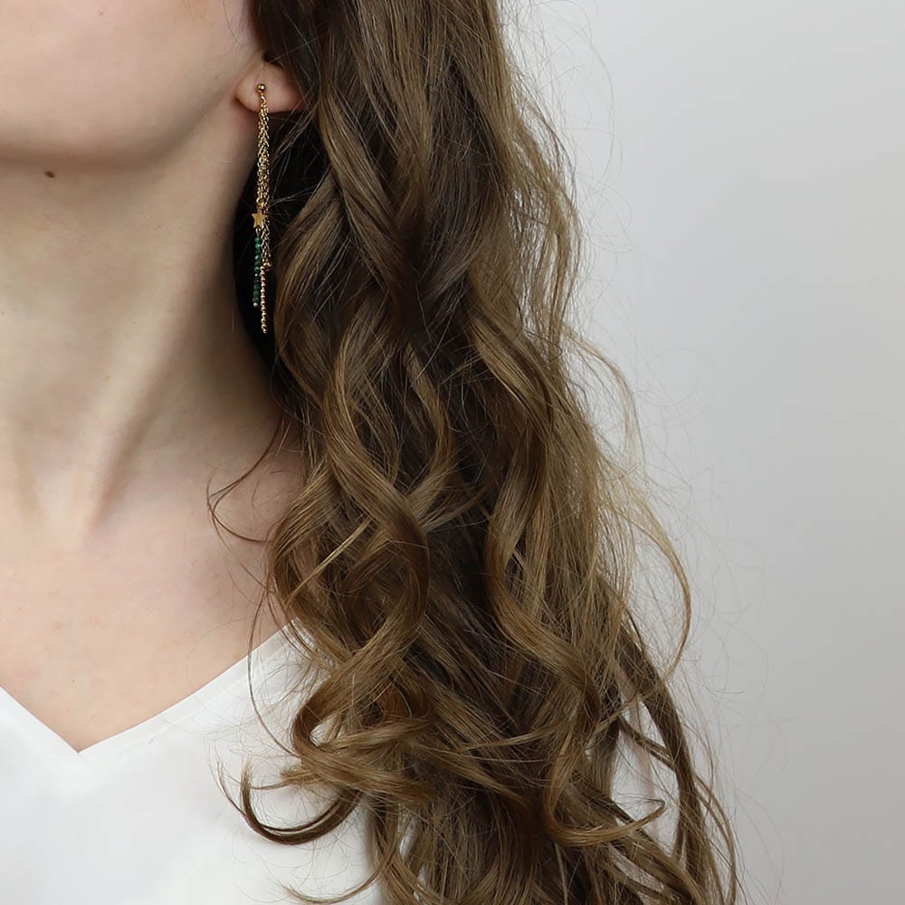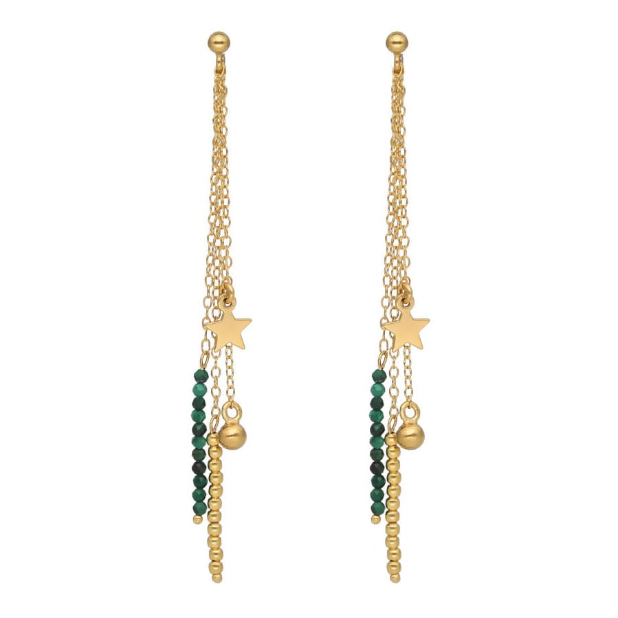 Zielony akcent w formie malachitu dodaje kolczykom głębi oraz podkreśla ich elegancki charakter. Kolczyki są ozdobione małymi gwiazdkami, które dodają im uroku i delikatności.