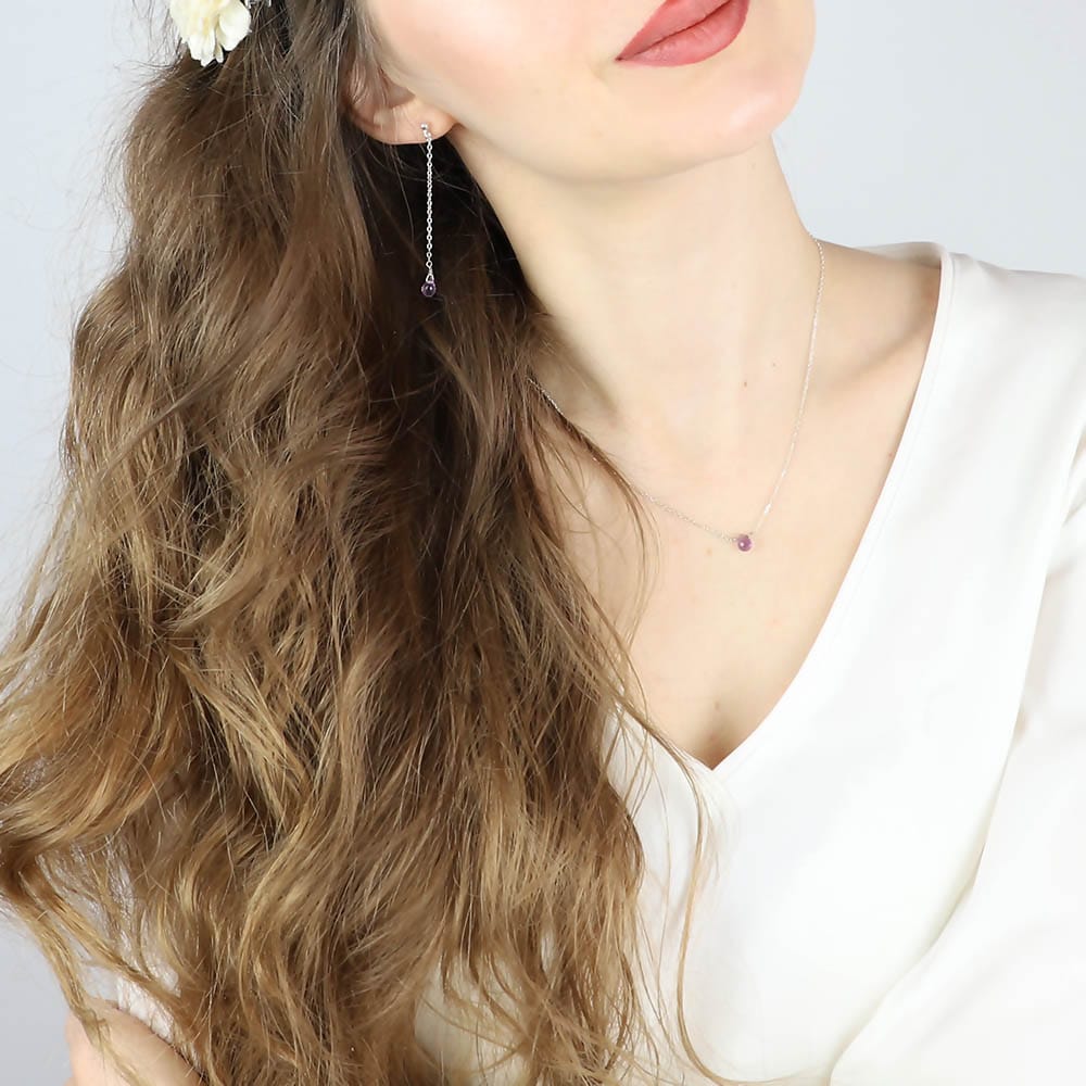 Kolczyk sztyft z kulką 3mm i podwieszoną pojedynczą brioletą ametystu na łańcuszku ankier