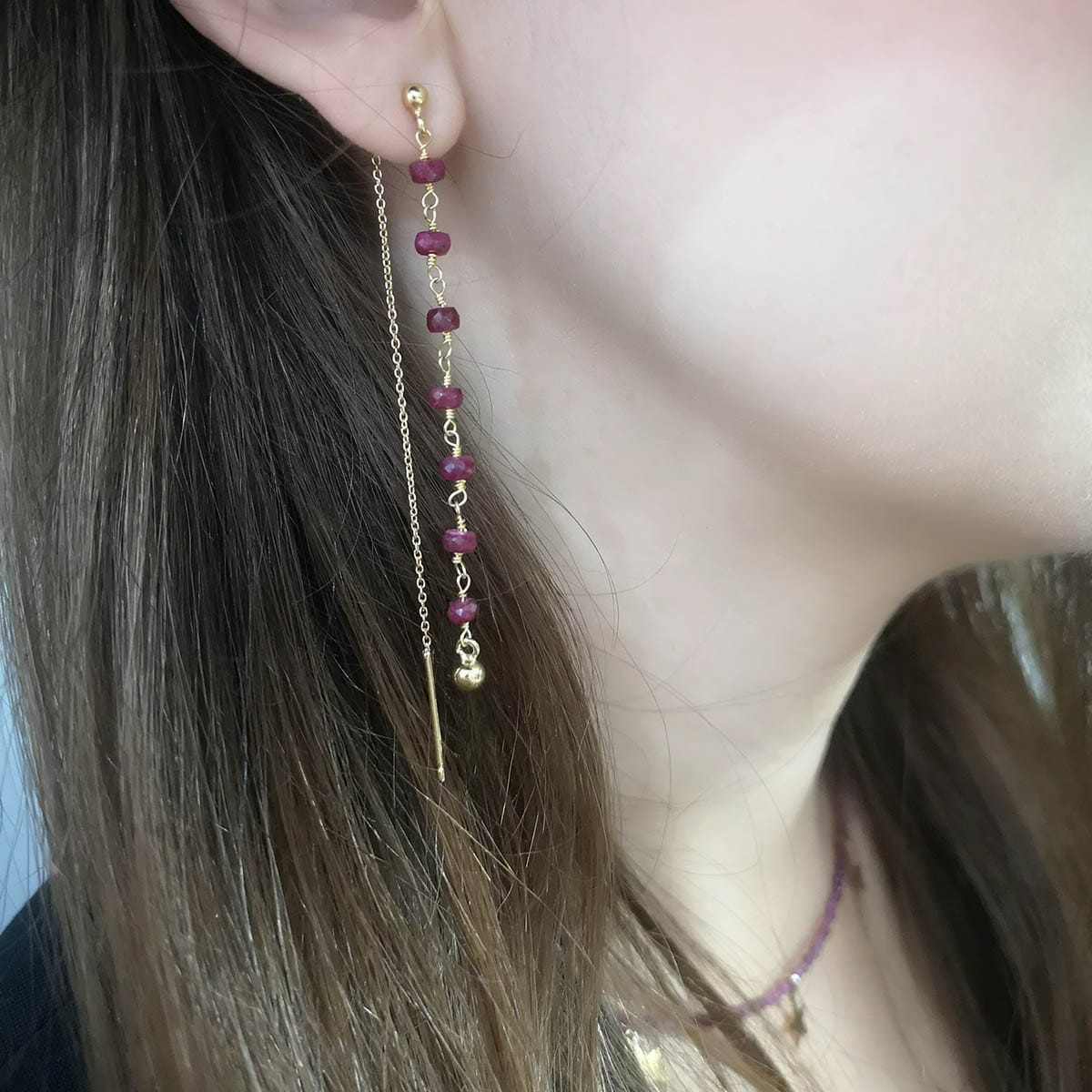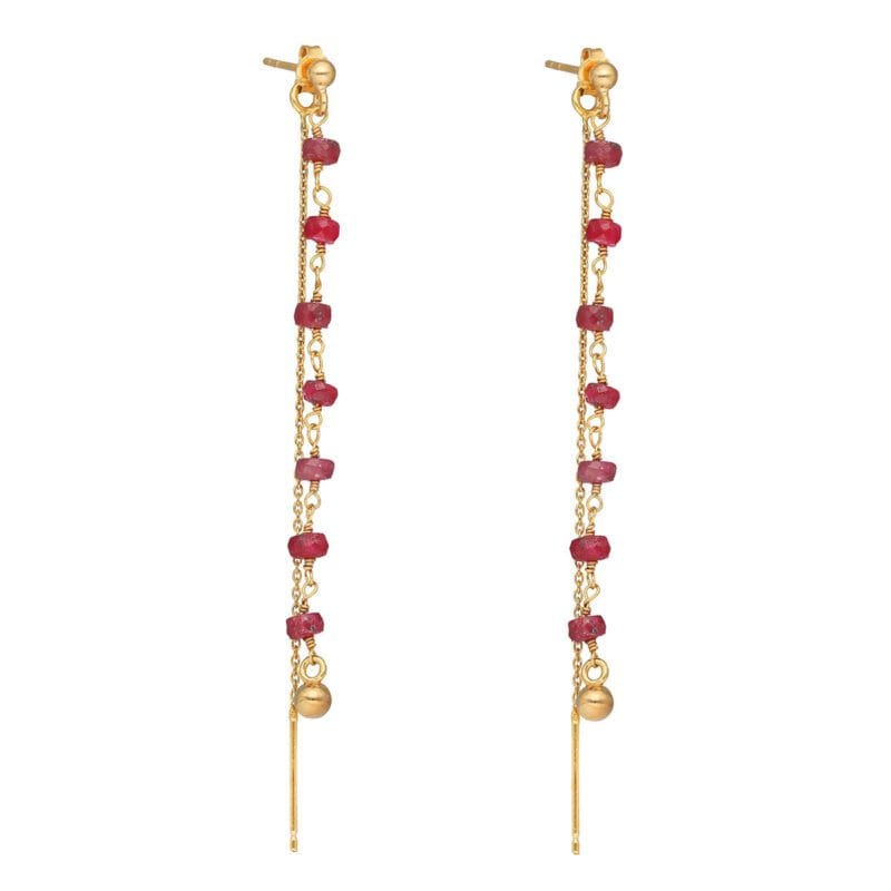 Damskie kolczyki z rubinami na łańcuszku ze srebra próby 925 powleczonego złotem. Rubin w formie fasetowanych oponek.