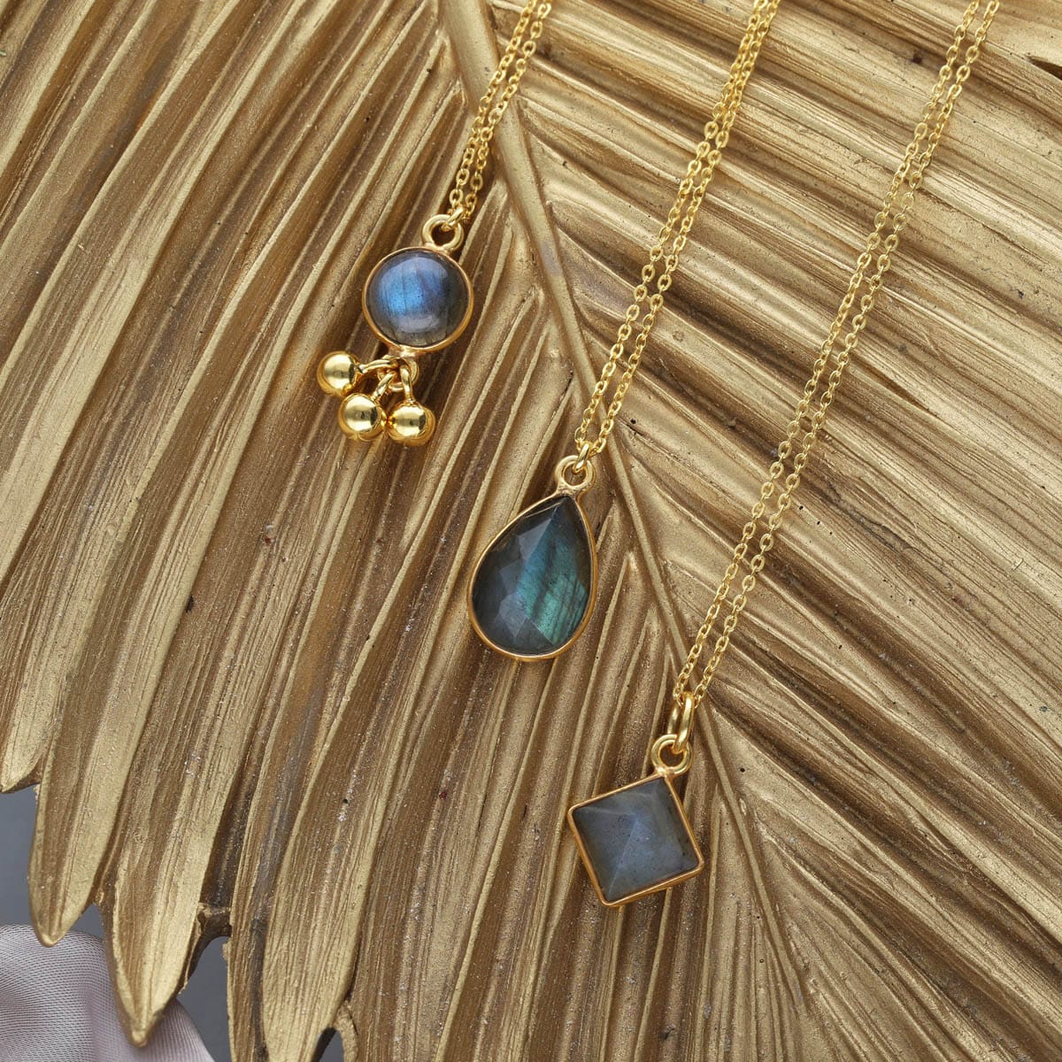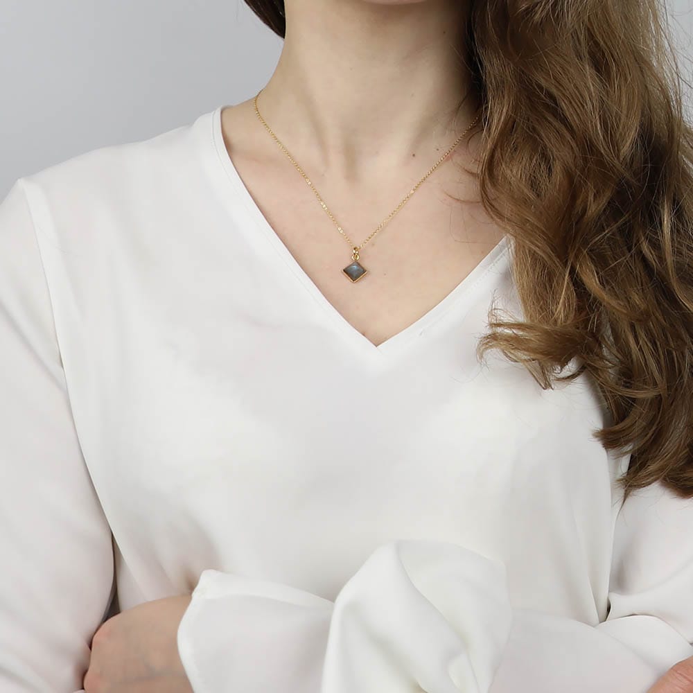 Damski naszyjnik srebrny pozłacany z piramidką labradorytu wykonany ze srebra próby 925 pokrytego złotem.