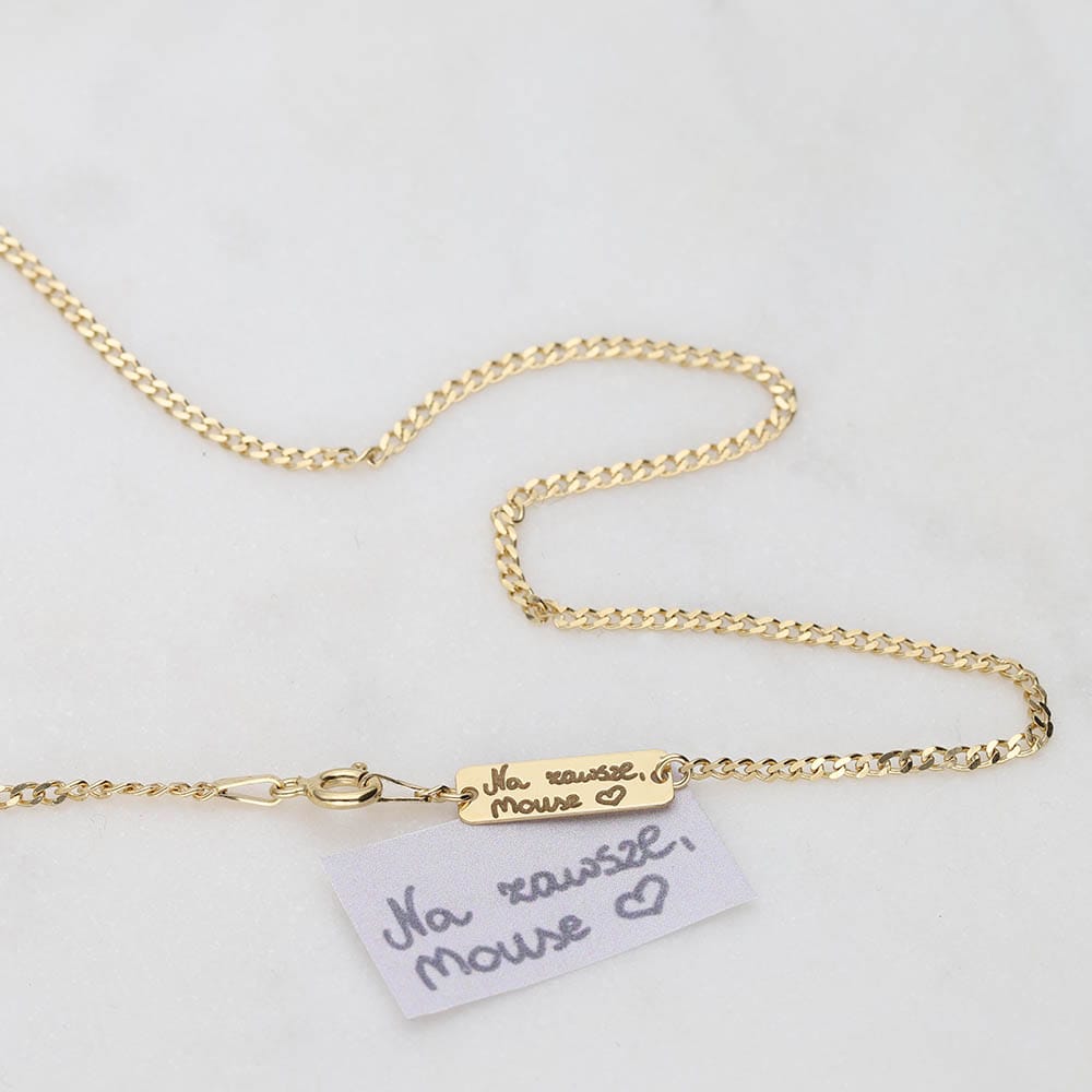 Jednym z największych atutów tego naszyjnika jest możliwość umieszczenia na nim własnoręcznej dedykacji. Dedykacja ta umieszczona jest na blaszce przy zapięciu łańcuszka, co dodaje naszyjnikowi unikalnego charakteru i sprawia, że staje się on nie tylko modnym dodatkiem, ale także osobistym symbolem. Wysyłasz do nas zdjęcie dedykacji napisanej na białej kartce, a my wykonujemy grawer na celebrytce.