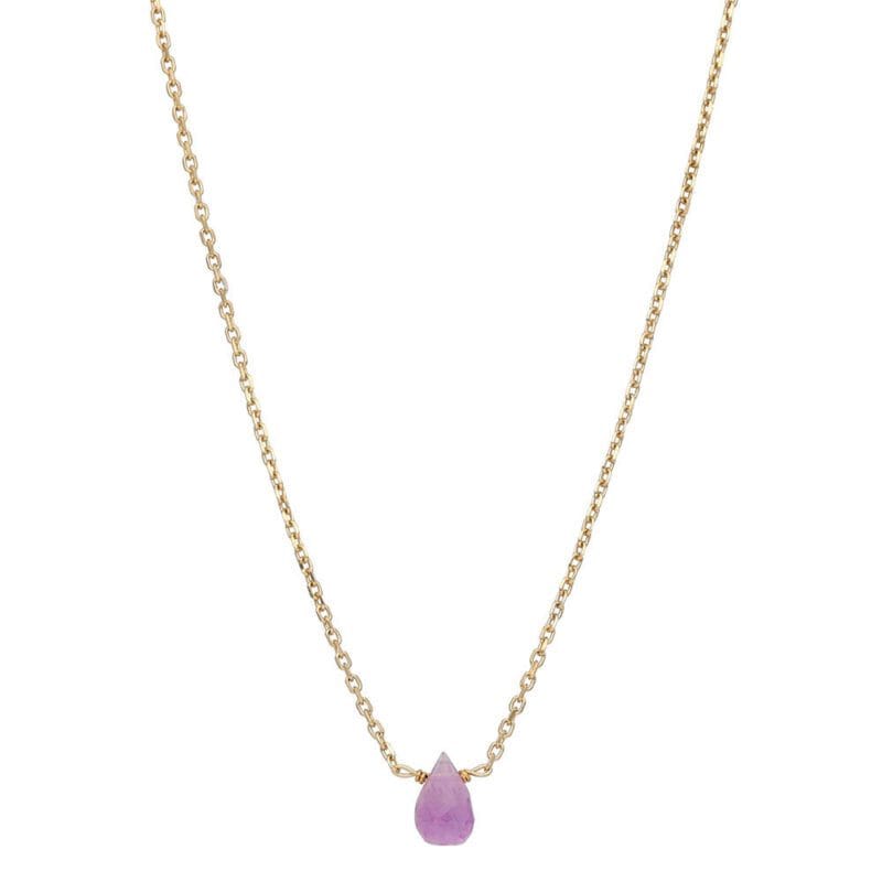 Ametyst w formie kropli, oszlifowany w sposób podkreślający jego niezwykły blask, jest naturalnym kamieniem, którego każdy egzemplarz jest unikatowy, co czyni każdy naszyjnik wyjątkowym.