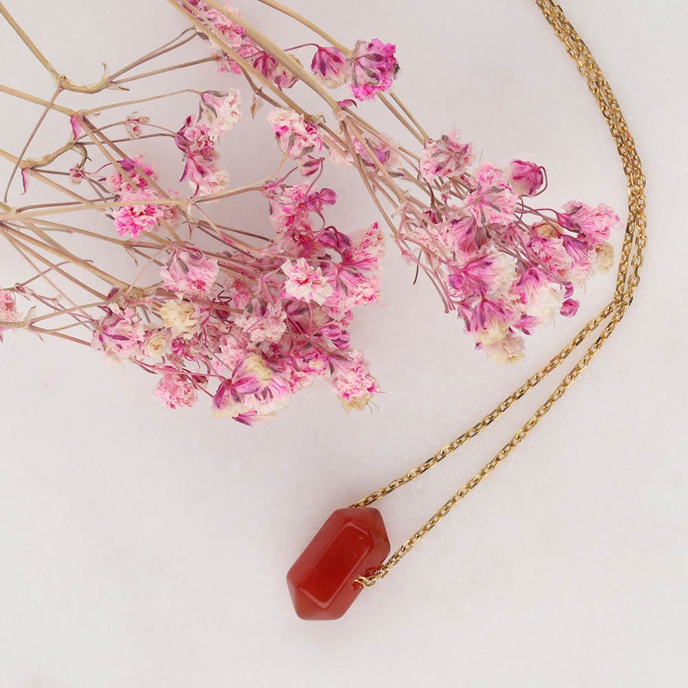 Delikatny naszyjnik z karneolem, wykonany ze srebra próby 925 powleczonego żółtym złotem o grubości powłoki około 1µm. Głównym elementem naszyjnika jest modny wisiorek z naturalnego karneolu w kształcie grota.