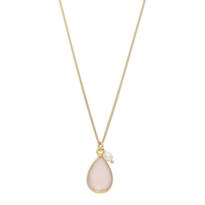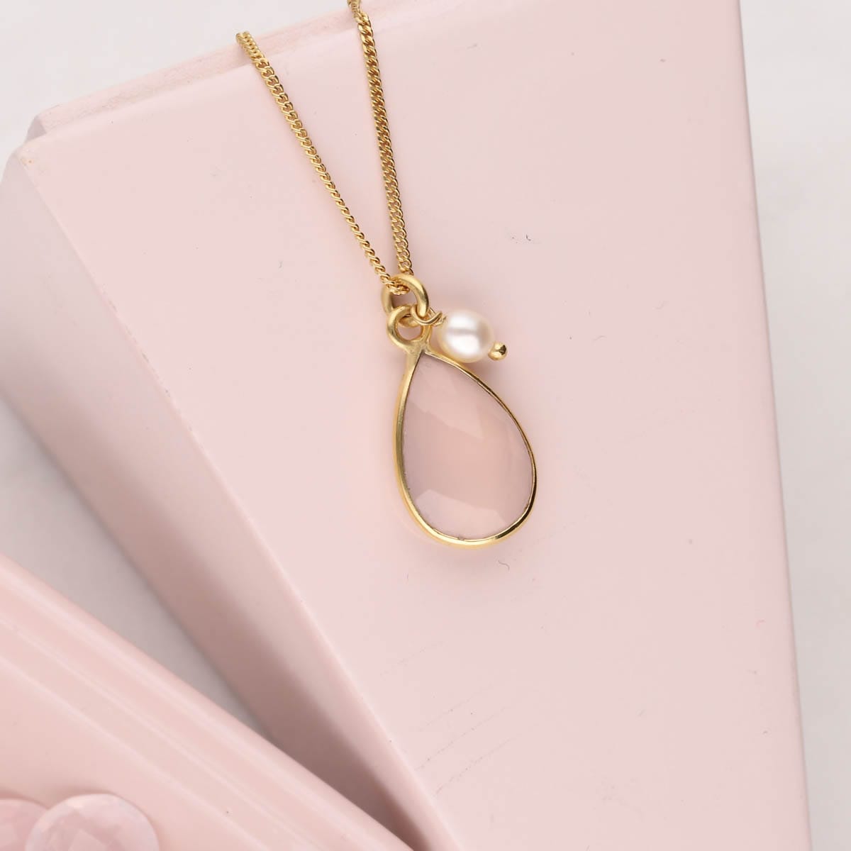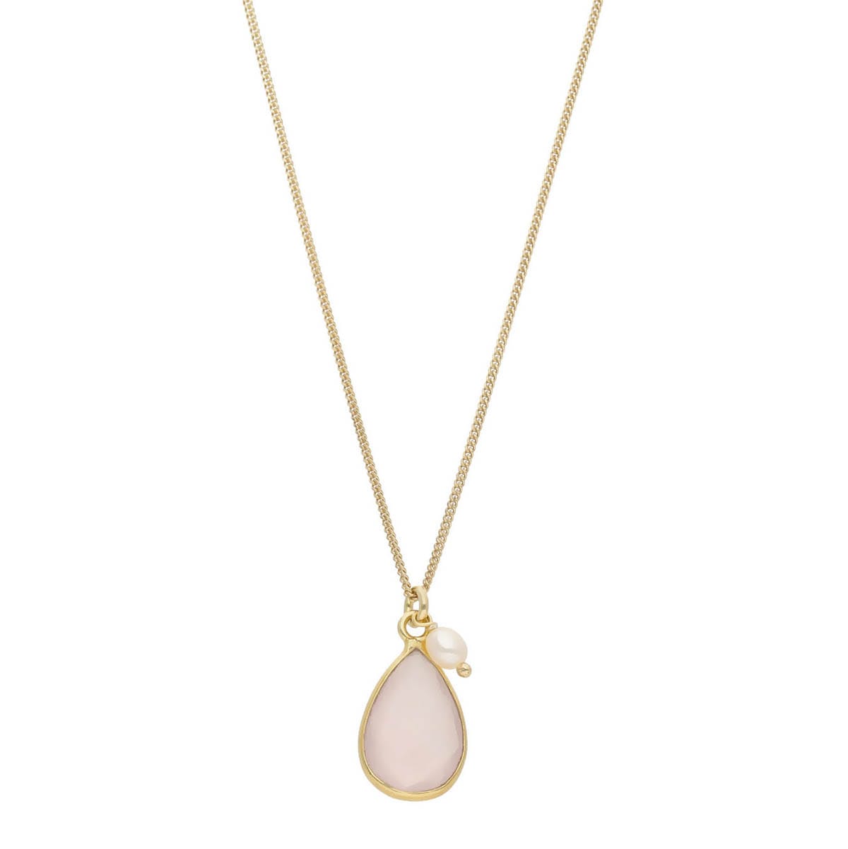 Damski naszyjnik srebrny pozłacany o długości 45 centymetrów wykonany ze srebra próby 925 powleczonego złotem, zakończony zawieszką z kwarcu różowego oraz perłą.