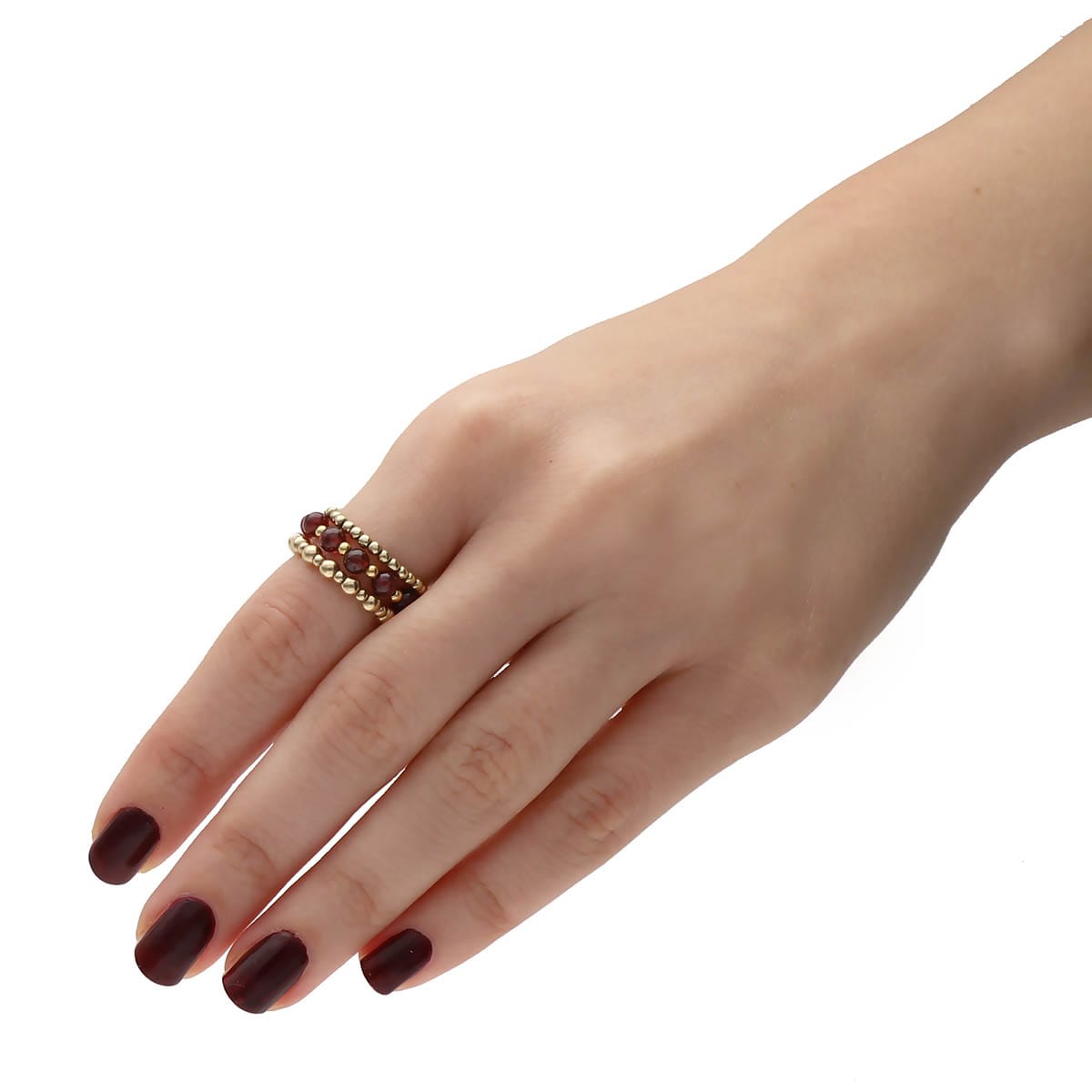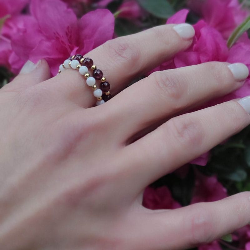 Pierścionek elastyczny z granatem gold filled BURGUNDY to wyjątkowy dodatek, który łączy w sobie elegancję i subtelność.