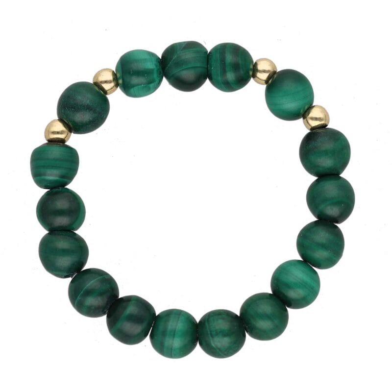 Damski pierścionek elastyczny z malachitem w formie kuleczek 3.5mm oraz pozłacanych kulek srebra 925 w rozmiarze 2 milimetry. Srebrne elementy zostały pokryte żółtym złotem, o grubości powłoki ok. 1µm, dzięki czemu warstwa o wiele dłużej pozostanie złota.