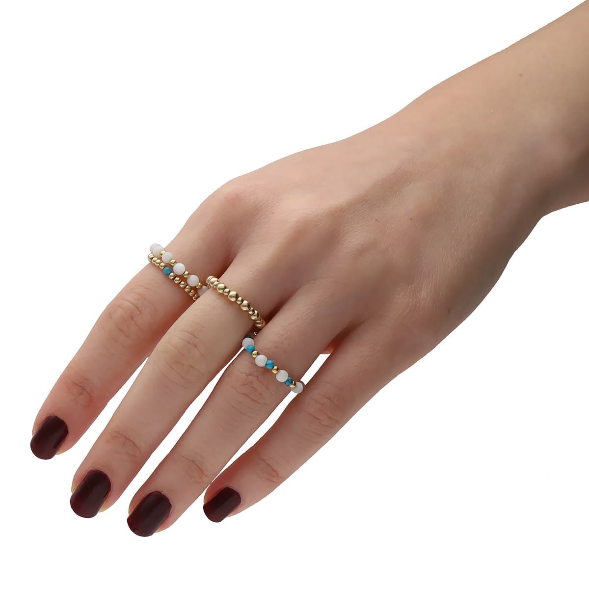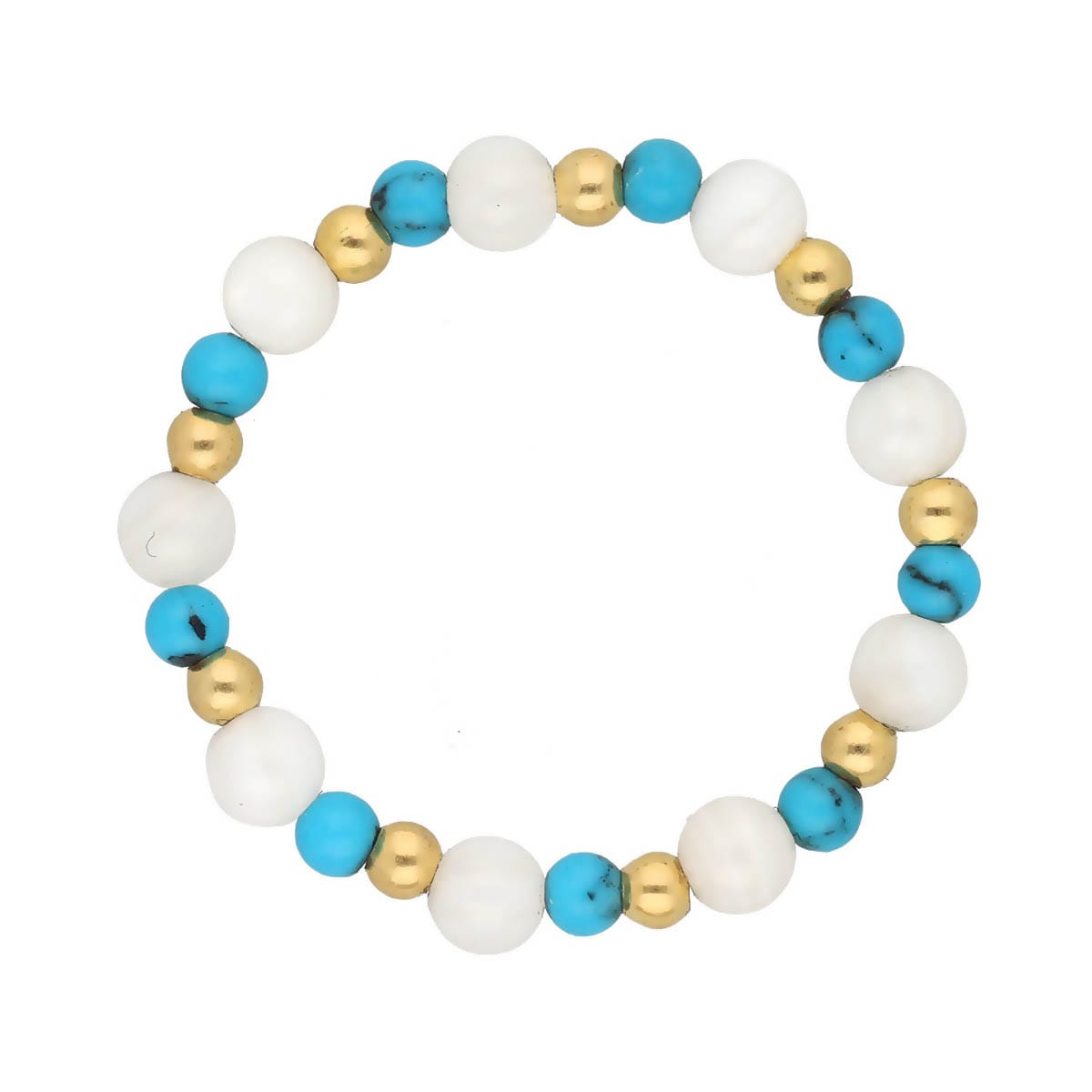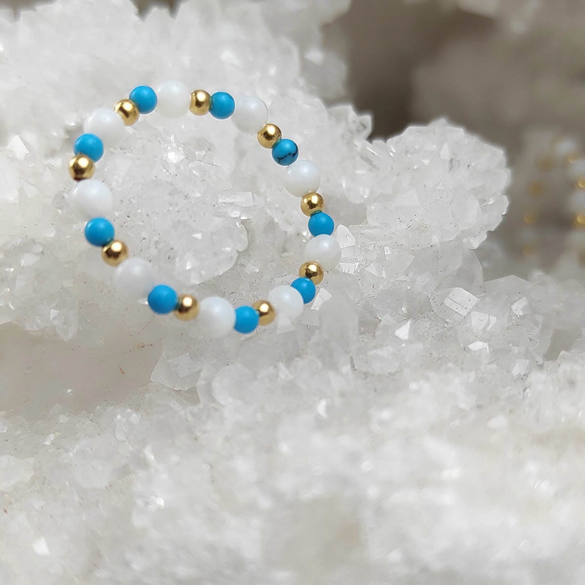 Pierścionek elastyczny gold filled z turkusem i masą perłową to wyjątkowy dodatek, który doda blasku każdej stylizacji.